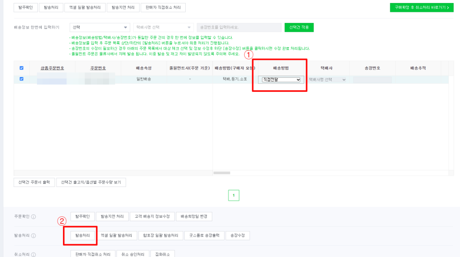 직접전달의 경우 택배사와 송장번호를 입력할 수 없기 때문에 배송완료 할 수 없고