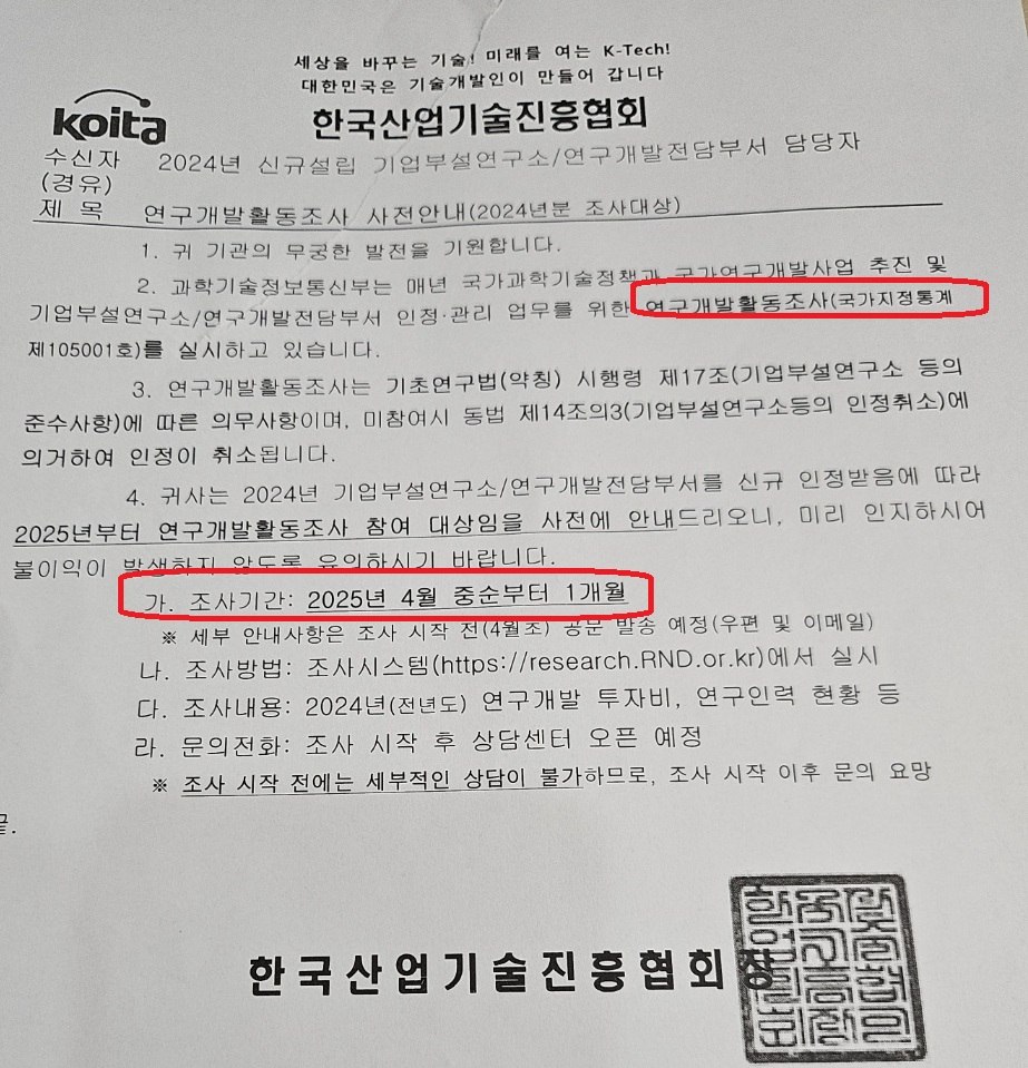 연구개발활동조사표 작성은 4월에 조사 진행 시 만들어서 안내 예정