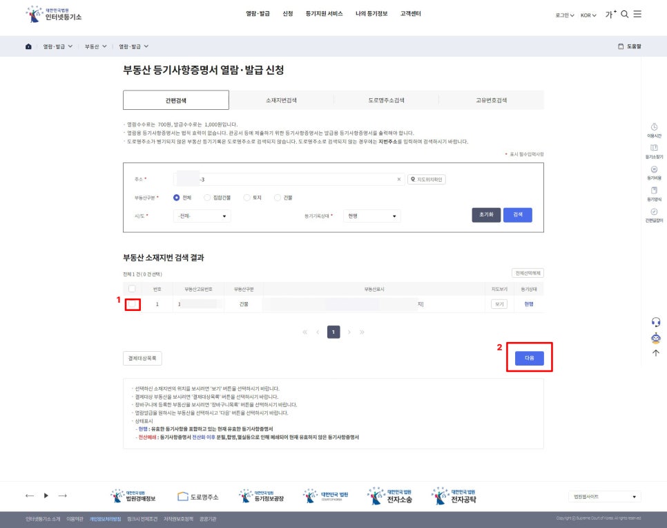 부동산 주소 확인 후 네모칸 체크 다음 눌러주세요.