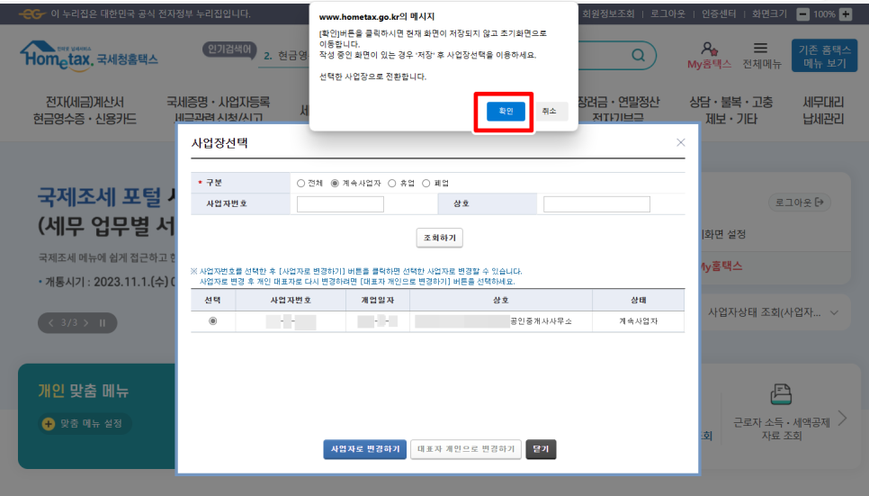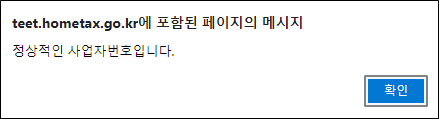 공급받는 자의 사업자등록번호를 입력 후 확인 버튼을 클릭해주세요. 이처럼 "정상적인 사업자 번호입니다. "라는 메시지 창이 나타납니다. 살아 있는 사업장 이 확인되었으니 확인 버튼을 클릭해주세요.