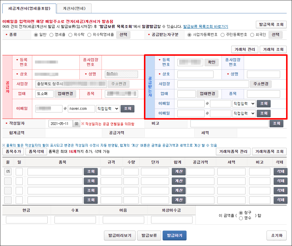 정상적인 사업자 번호가 확인이 되면 공급받는 자 입력 칸에 비활성화 되어 있던 입력칸에 입력을 할 수 있도록 활성화됩니다. 별 표시되어 있는 상호명과 성명을 정확하게 입력하고 , 사업장 주소, 업태, 종목, 세금계산서 안내 메일을 받을 수 있는 거래처 담당자의 이메일 주소를 입력해 주세요. 거래처의 이메일 주소를 입력하면 세금계산서 발급했다는 확인 내용을 거래처 메일로 자동 전송됩니다.