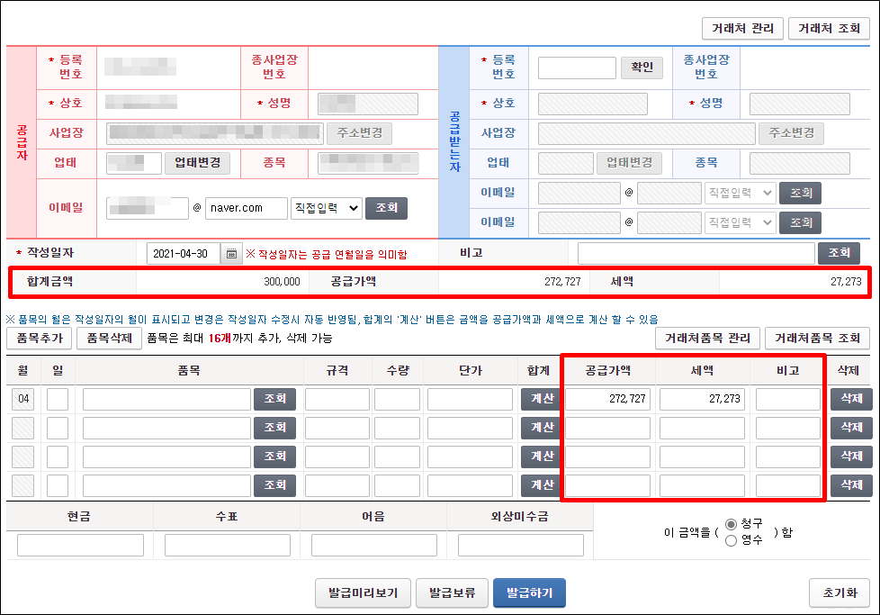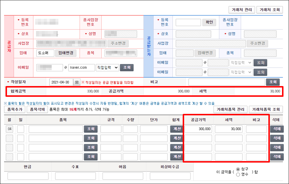 자동 계산된 공급가액과 세액은 자동으로 입력이 됩니다.