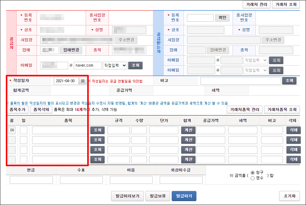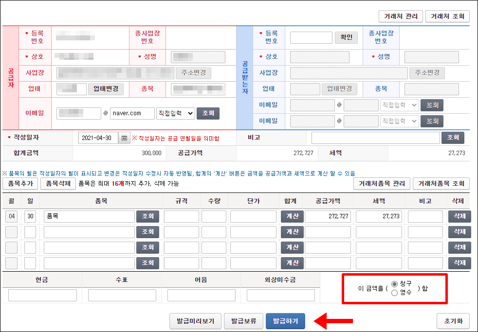 작성일자, 품목, 공급가액, 세액을 입력 이 되었으면 발급 만이 남았습니다. 발급하기 전에 이금액을 청구, 영수를 선택하게 되어 있습니다. 청구는 뭘까 영수는 뭘까 혼동하지 마세요.