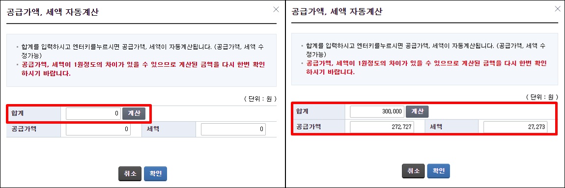 공급가액, 세액 자동계산할 수 있는 배너창이 나타나면 합계 입력창에 30만 원을 입력하고 계산 버튼을 클릭하면 자동적으로 공급가액과 세액이 계산되어서 나와요. 확인 버튼을 클릭해주세요.