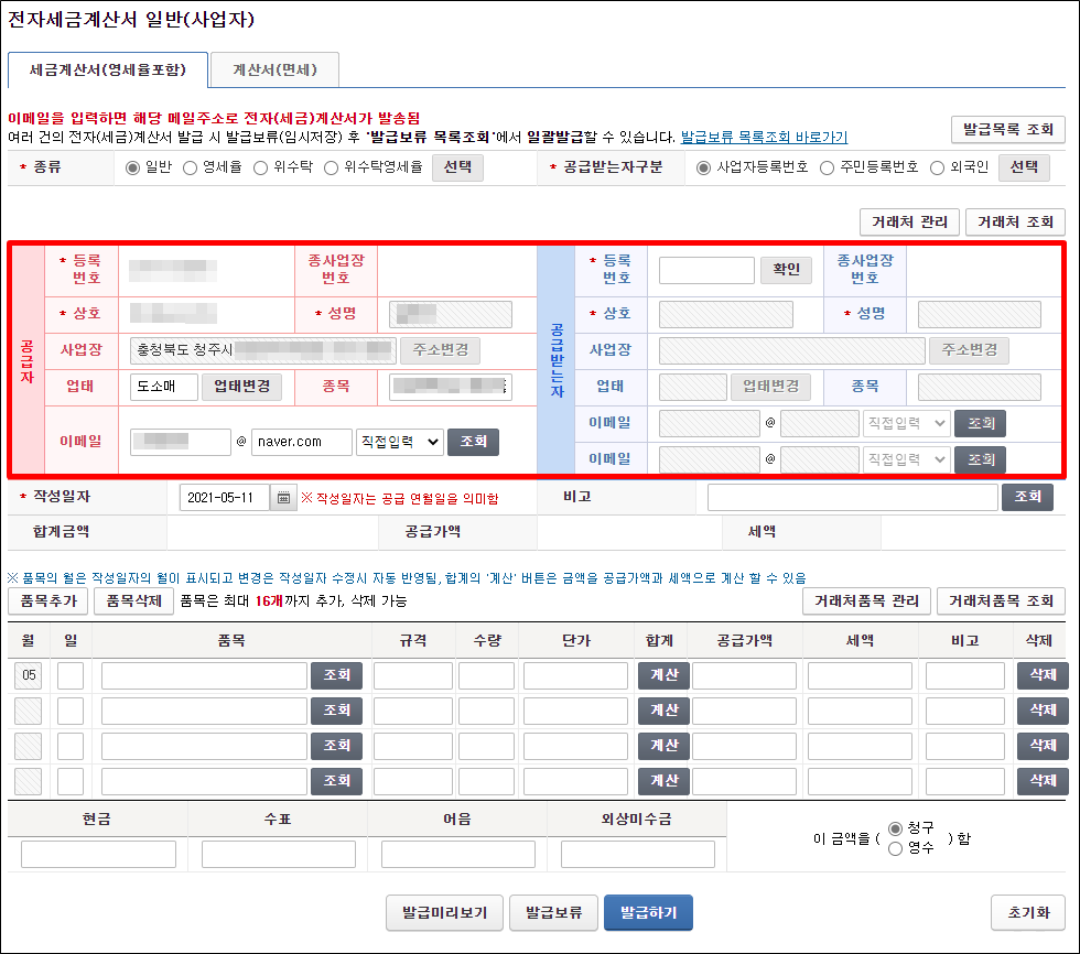 건별 발급을 통해 세금계산서 발급 창으로 넘어오면 공급자, 공급받는 자 입력 창이 나타 납니다. 공급자, 공급받는자 말 그대로 공급자는 세금계산서를 발급해야 하는 사업자를 말하고, 공급받는 자는 세금계산서를 발급받아야 하는 사업자(거래처)를 말합니다. 공급자(본인 사업장 정보)는 자동으로 등록이 되어 있습니다.