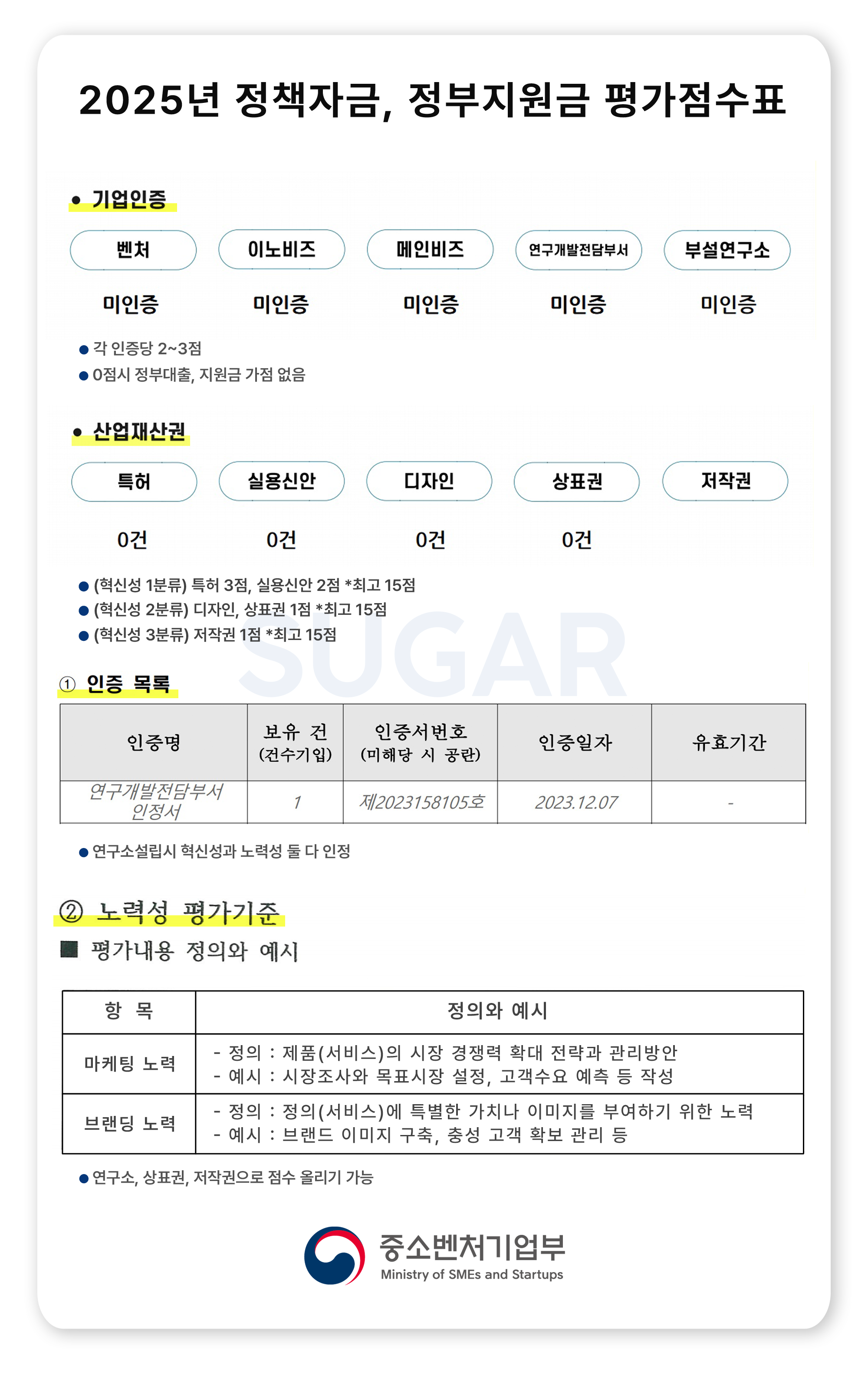 기업인증, 산업재산권(혁신성 1,2,3분류) 점수가 낮다면 애초에 신청해도 무의미합니다.