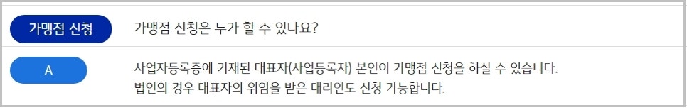 가맹점 신청의 경우 사업자등록증에 기재된 대표자 본인이 가맹점 신청을 해야 하며 법인은 대리인도 신청이 가능합니다.