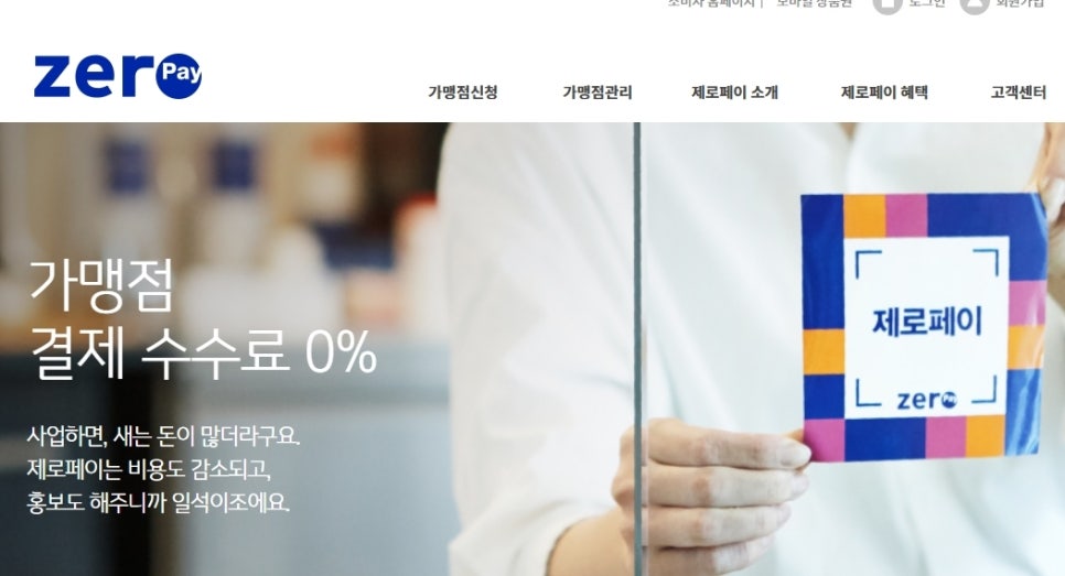 그러면 간편하게 신청을 할수 있는 온라인 방식으로 신청을 해보도록 하겠습니다. 제로페이 홈페이지에 접속을 하게 되면 상단에 회원가입 버튼이 있는데 회원가입이 안되어 있는 경우 제로페이 가맹점 신청서를 하기전에 가입을 진행하면 좋습니다.