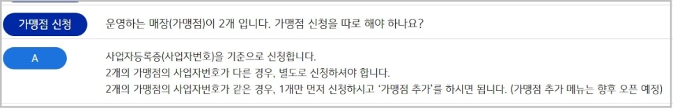 운영하는 가맹점 매장이 2개 이상인 경우에는 사업자 등록증 기준으로 다른 경우 별도로 신청을 해야 하며 같은 경우 가맹점 추가 버튼을 통해서 추가만 진행하면 됩니다.
