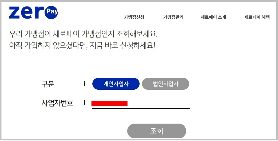 먼저 사업자등록번호를 입력후 조회 버튼을 클릭합니다. 그러면 가맹점 등록여부를 확인할 수가 있고 개인사업자나 법인사업자 구분해서 확인이 가능합니다.