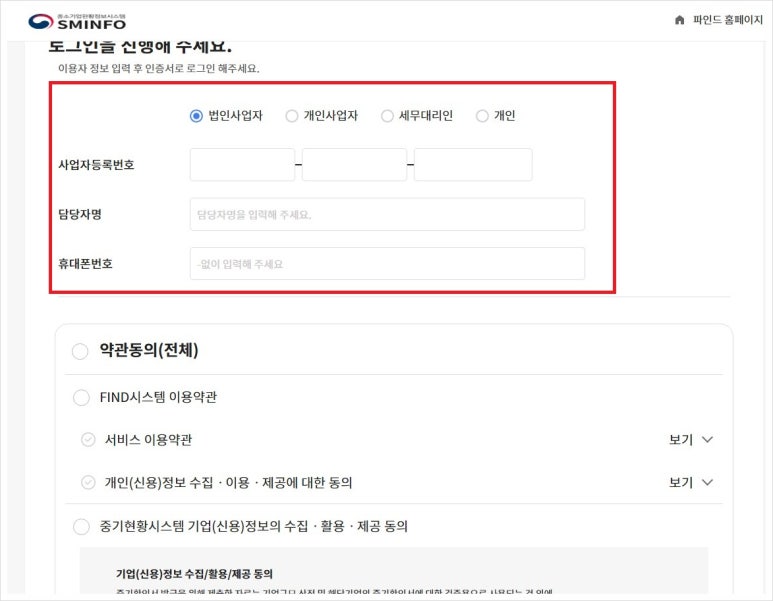 먼저 법인의 경우 사업자 정보와 담당자명 휴대번호를 입합니다.