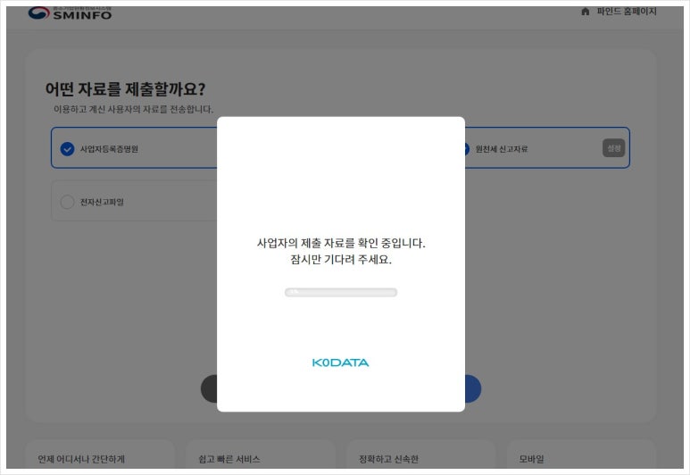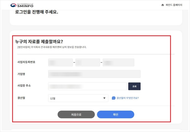 제출할 사업자 정보가 나오는데요. 가입 시 입력한 정보가 자동으로 나오니 확인만 눌러 주시면 됩니다.