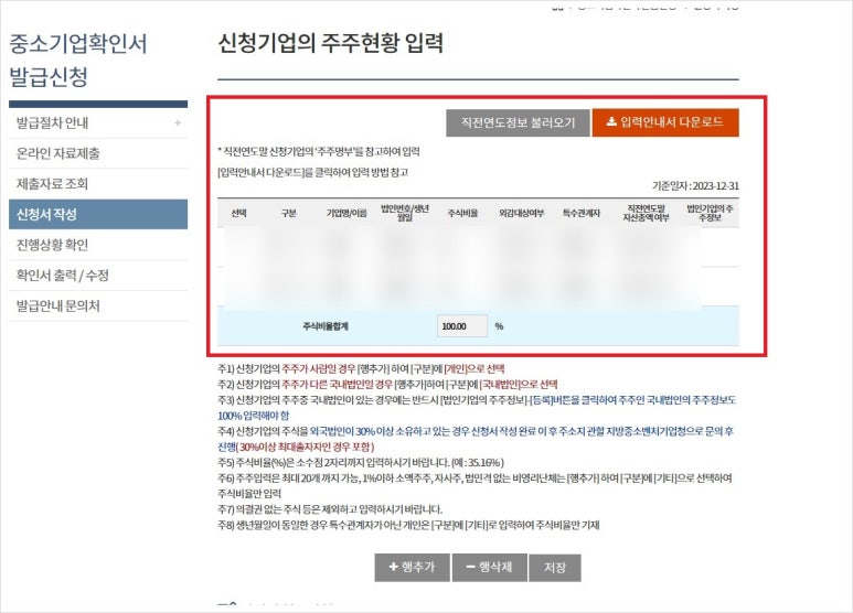 법인의 경우 신청기업의 주주 현황 입력 사항이 나는데요. 주식배율합계는 100%가 되어야 작성이 마무리됩니다.