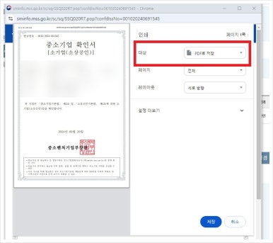 참고로 '확인서 인쇄'에서 프린터 바로 인쇄하여도 좋지만, 대상 pdf로 저장을 눌러 컴퓨터에 저장해 두시면 더욱 좋겠네요.