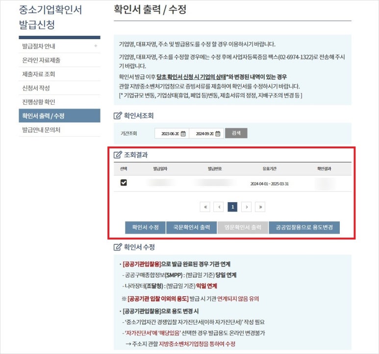 마지막으로 확인서 출력/수정 항목으로 들어가면 이렇게 발급 일자와 유효기간이 나옵니다. 그리고 '국문 확인서 출력'을 선택하여 발급받으면 됩니다.