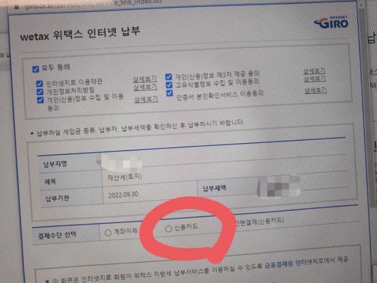 저의 경우는 본인 명의 신용카드로 납부를 진행했습니다.