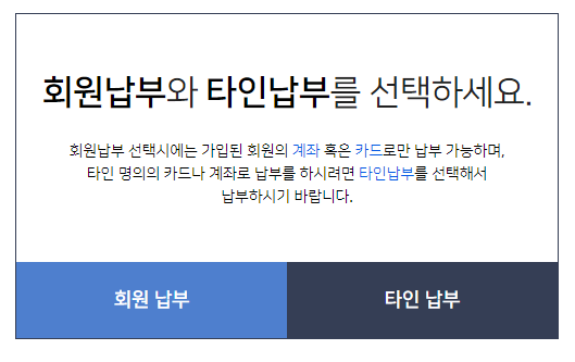 여기서 회원납부 or 타인납부 중 선택해서 납부 가능한데요. 납부하고자 하는 카드/계좌 명의에 따라서 조건이 다르니 잘 확인하고 선택해 줍니다.