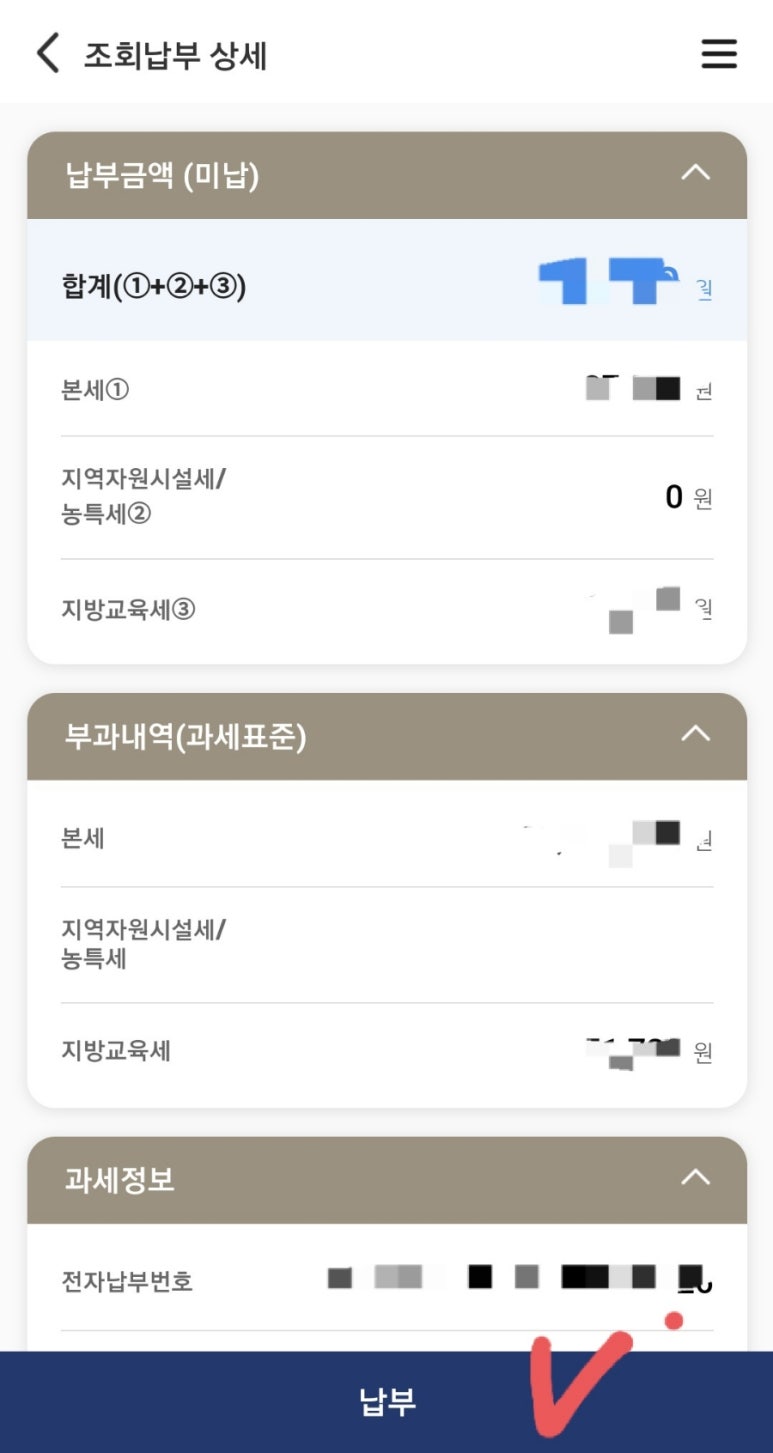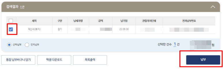 목록에 재산세 항목이 많이 있다면 납부하고자 하는 항목에 체크 후 [납부] 진행을 하면 됩니다.