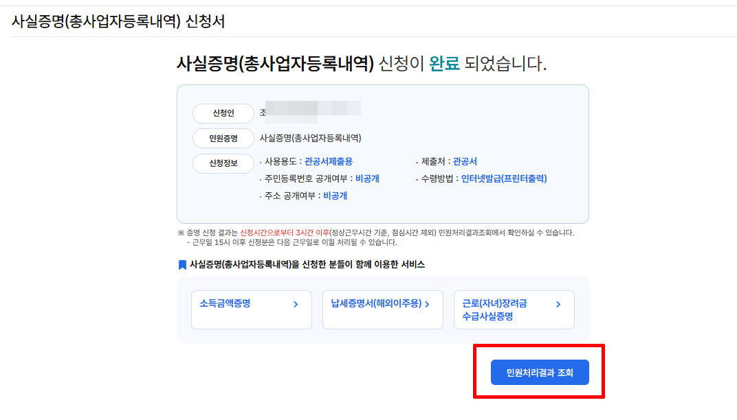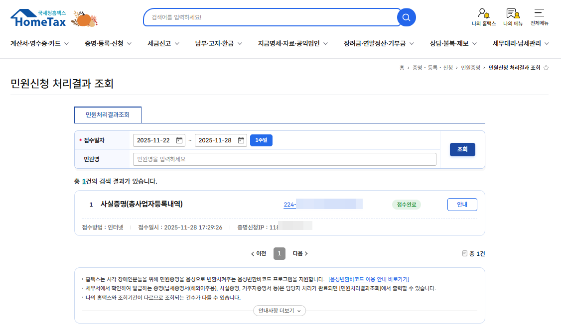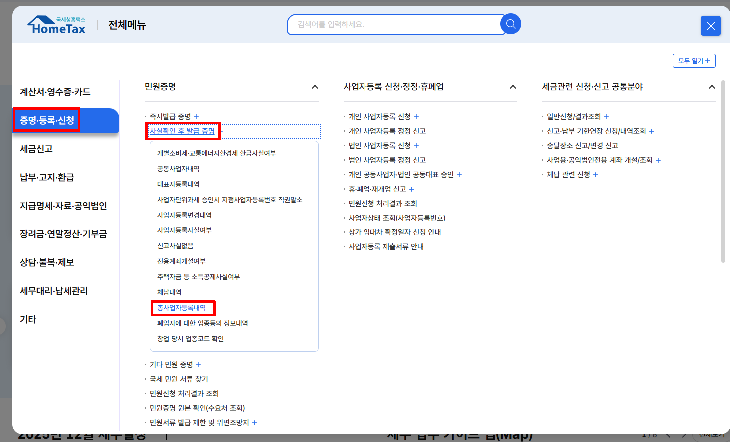 증명.등록신청 → 사실확인 후 발급 증명 → 총사업자등록내역