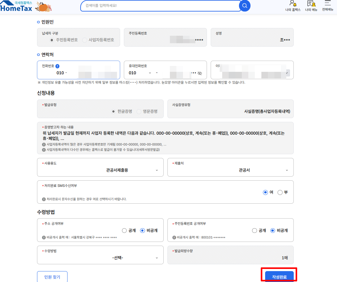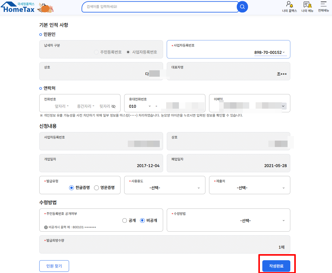 인적사항 작성 후 잔성완료 진행해주시면됩니다.