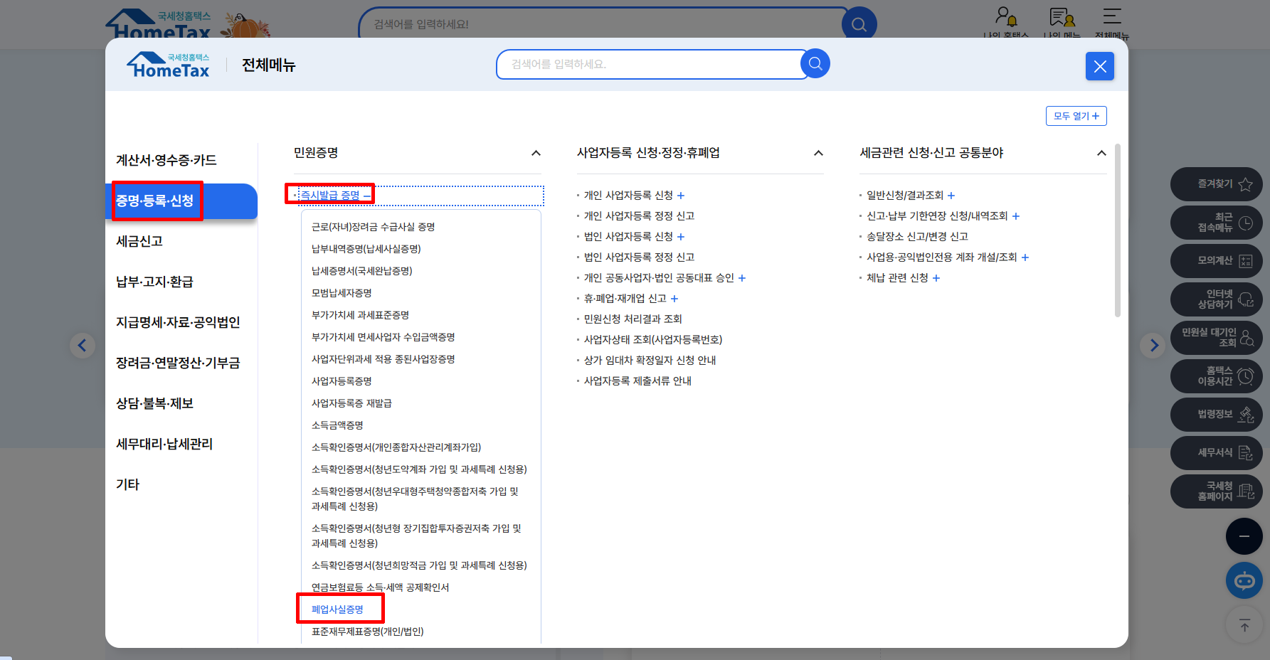증명.등록신청 → 즉시발급증명 → 폐업사실증명 선택해주세요.