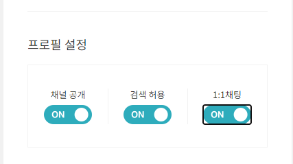 그리고 채널관리자센터에 들어가서 프로필설정에서 채널공개, 검색허용, 1대1채팅을 모두 ON으로 바꿔주었다