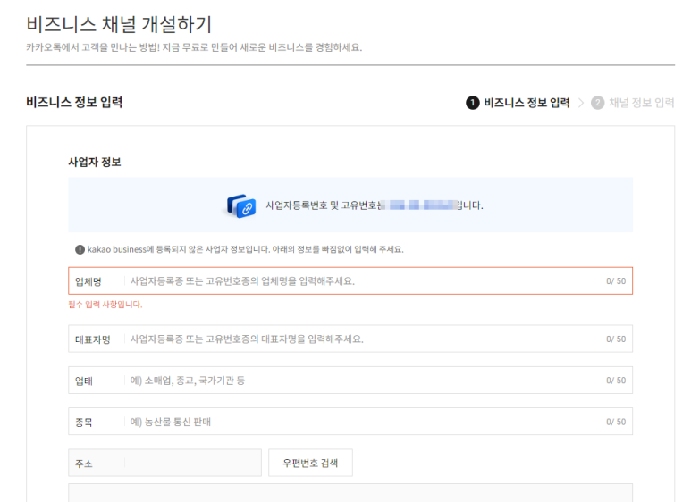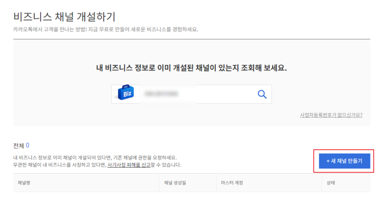 ④ 이미 개설된 채널이 있는지 사업자등록번호를 조회해본다