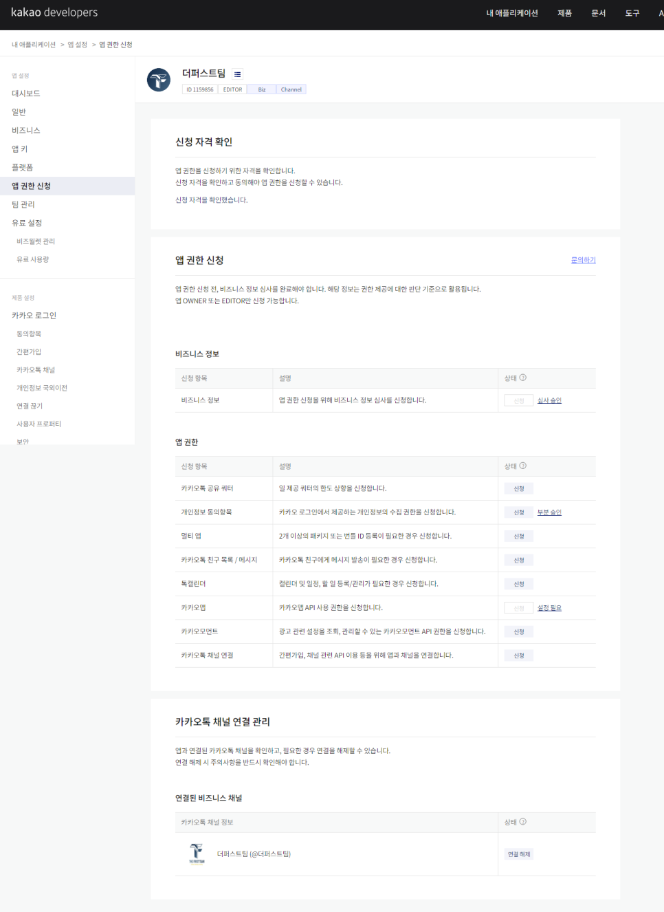 비즈니스채널로 연동은 심사대기가 필요하다고 나와있다.