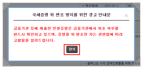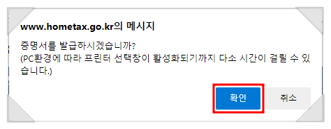 증명서 발급을 묻는 팝업과 위·변조 방지 경고 안내문 모두 확인 후 닫아주세요.