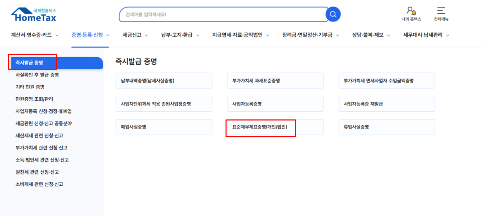 [증명. 등록.신청]-[즉시발급 증명]-[표준재무제표증명(개인/법인)]을 순서대로 선택합니다.