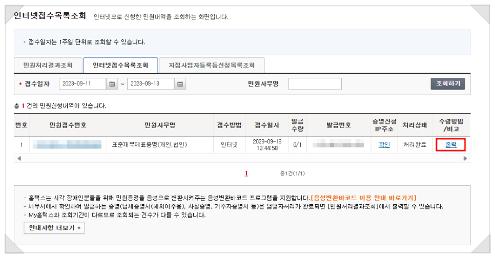 4. 표준재무제표증명 발급 - 인터넷 접수목록 조회