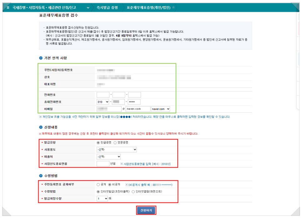 빨간색 네모칸의 신청 내용, 수령방법을 기입하여 주신 후
