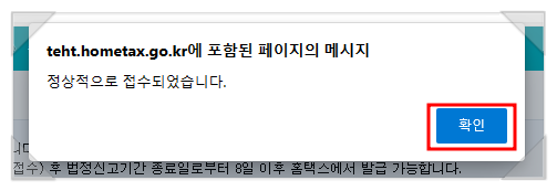 정상적으로 접수되었다는 팝업의 [확인] 버튼을 눌러줍니다.