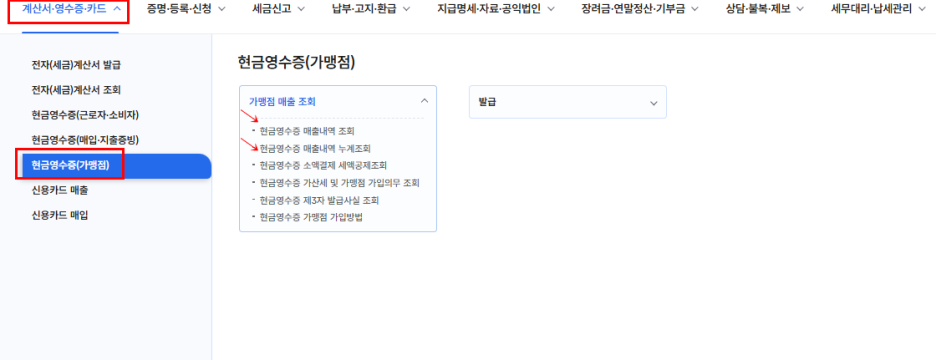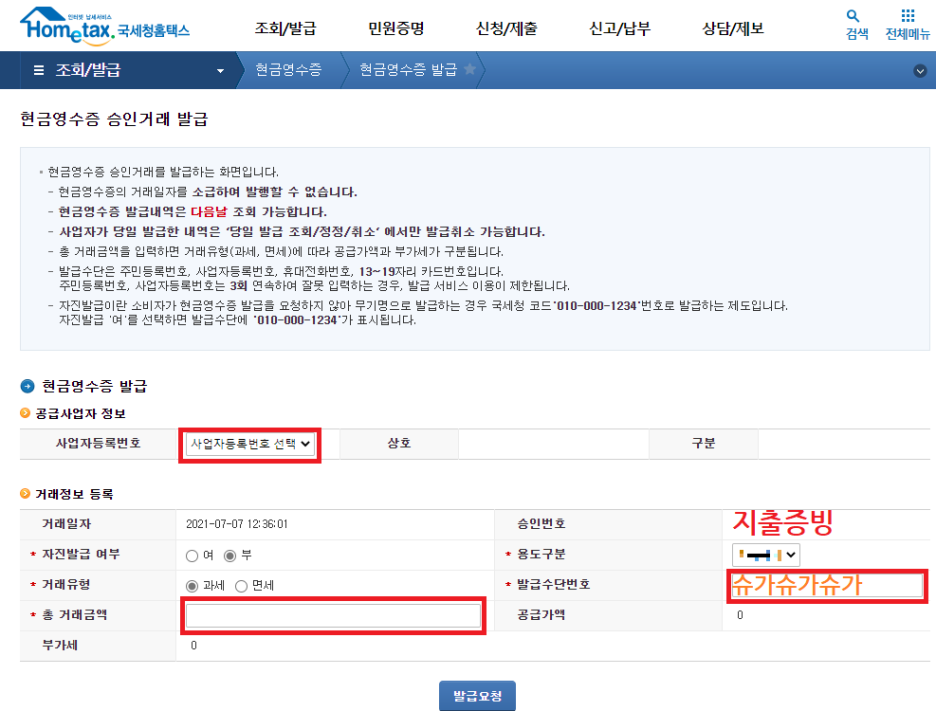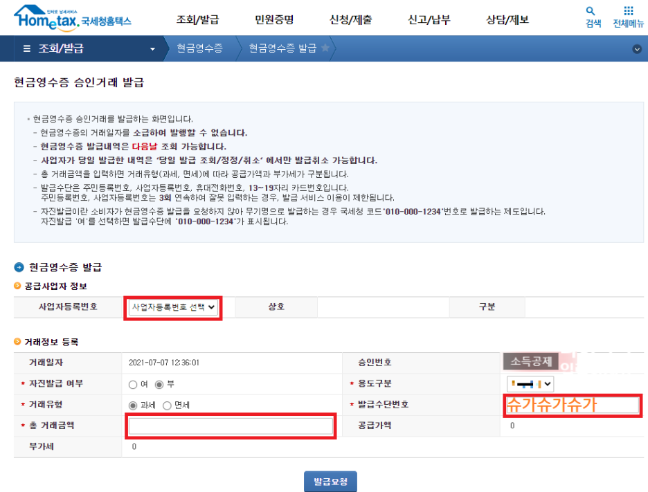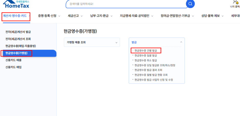 [계산서.영수증.카드] - [현금영수증] - 현금영수증 건별 발급 선택해주세요.