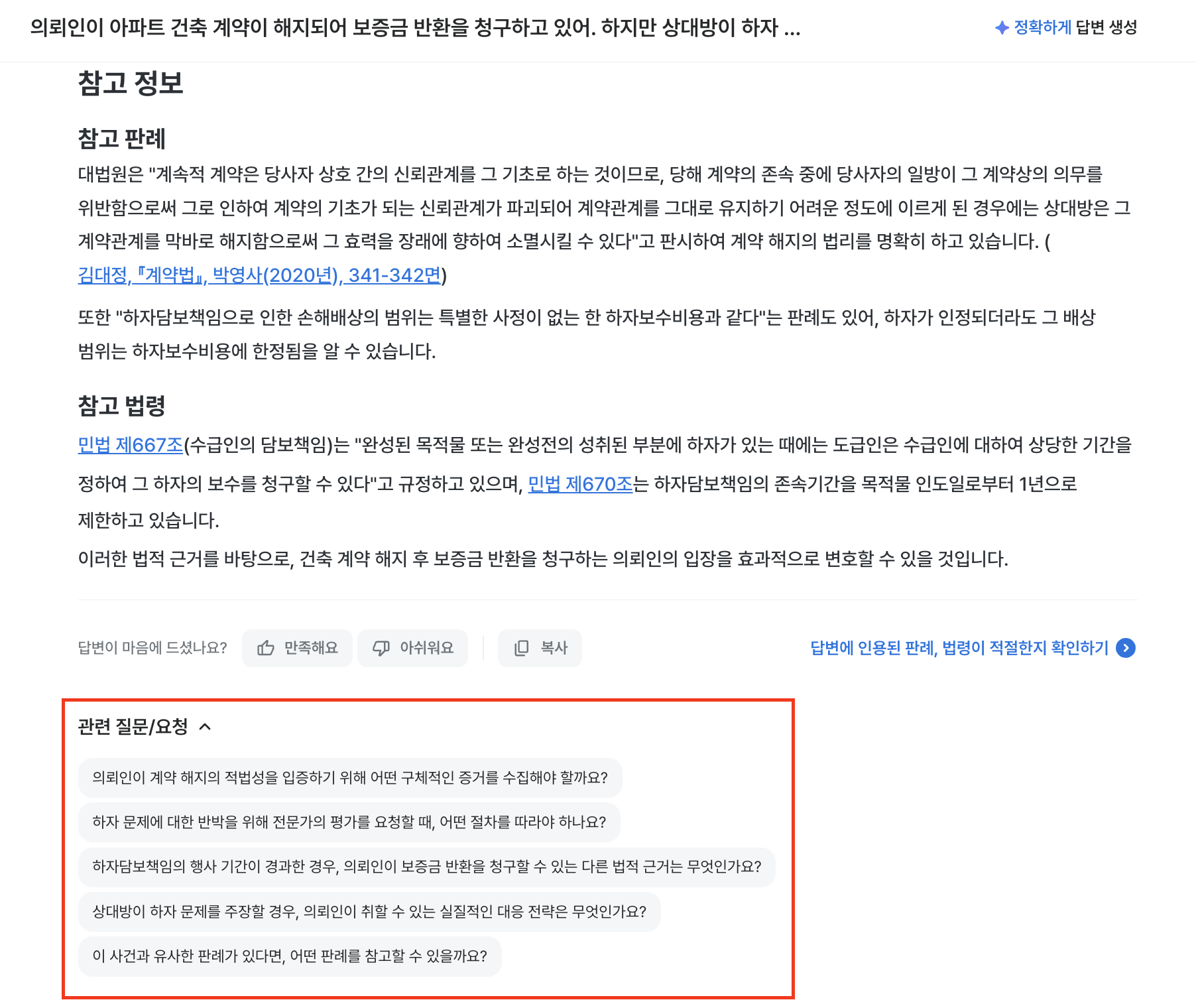AI가 답변을 완료한 후, 답변 하단에 [관련 질문/요청] 영역이 나타납니다.