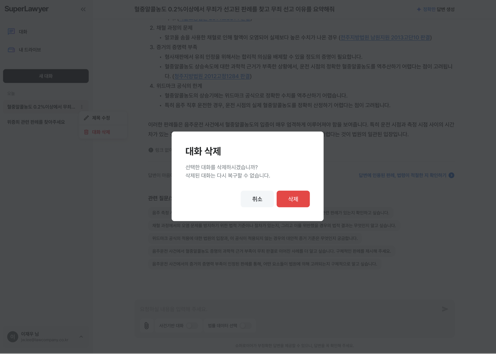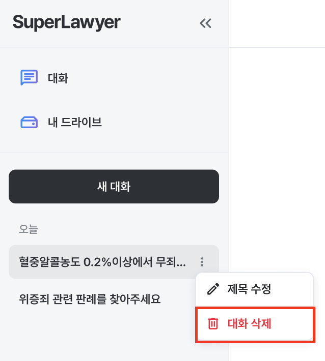 사용자가 더 이상 보관할 필요가 없는 대화를 완전히 삭제할 수 있습니다. 불필요한 대화를 정리하면, 사건별/이슈별로 대화 목록을 더 깔끔하게 관리할 수 있어요.