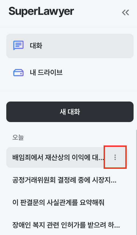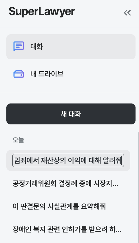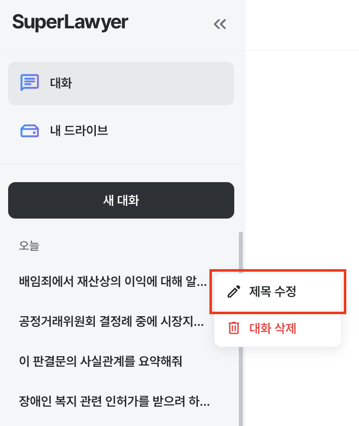 슈퍼로이어는 첫 질문이 대화방 제목이 됩니다. 하지만 대화가 쌓이다 보면 사건명·이슈명으로 정리하고 싶을 때가 생기죠. 대화 제목 변경 기능을 이용하면, 사용자가 직접 원하는 제목으로 정리할 수 있어 나중에 찾아보거나 관리할 때 더 편리해요.