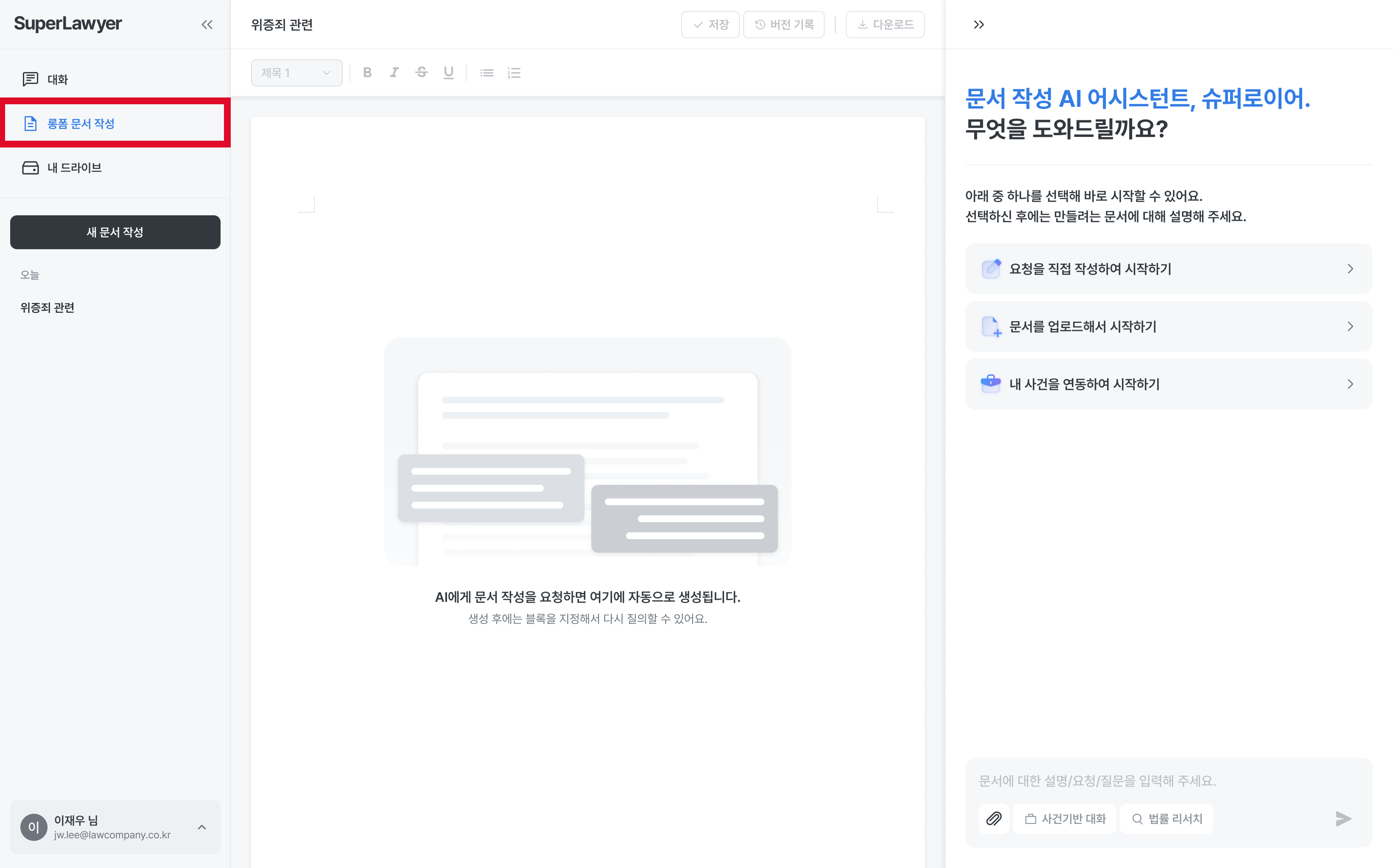 슈퍼로이어가 생성한 문서의 내용을 이용자가 직접 입력하여 자유롭게 수정할 수 있습니다. 필요한 문장이나 단어를 문서 내에서 즉시 고쳐보세요!