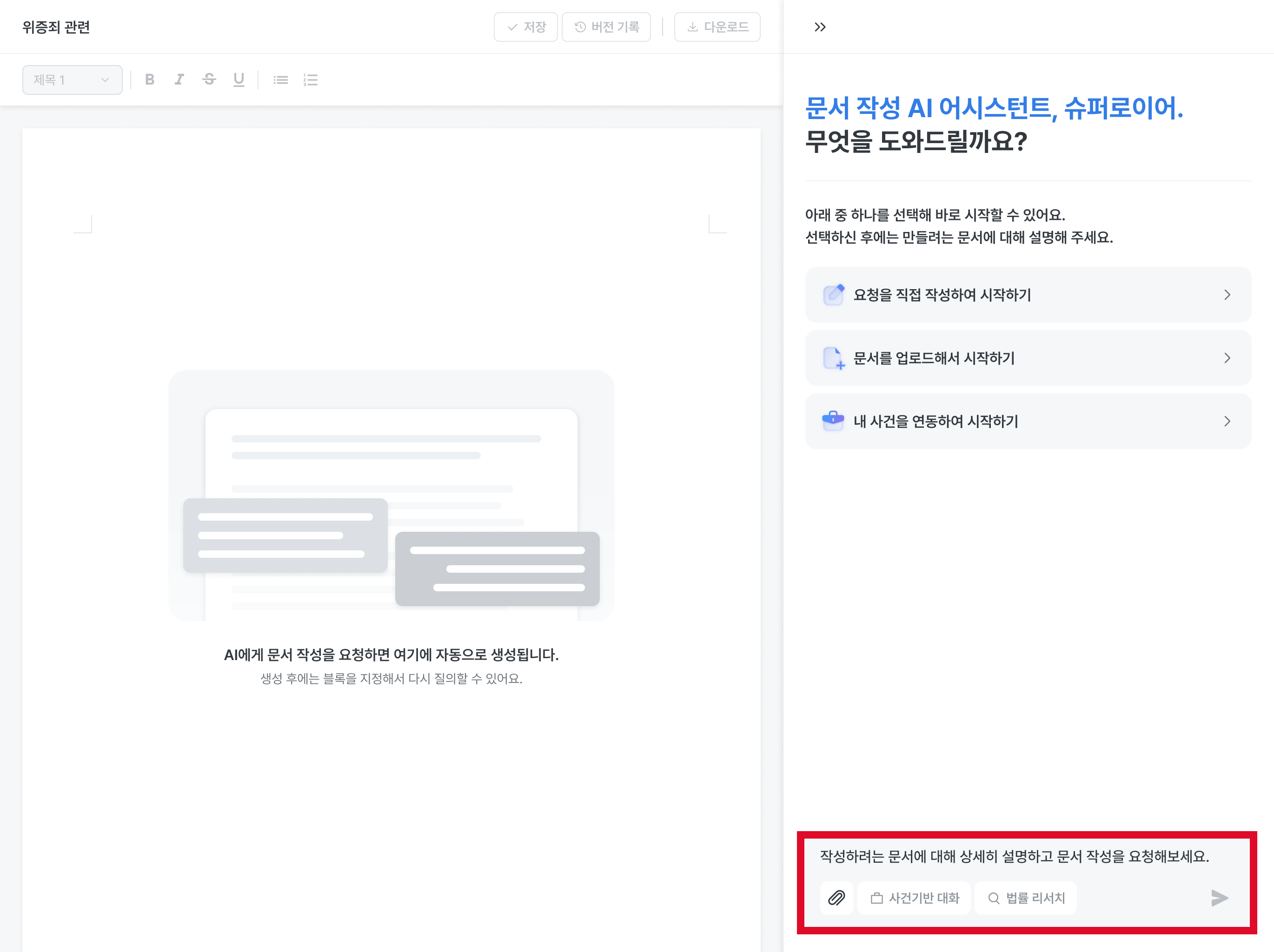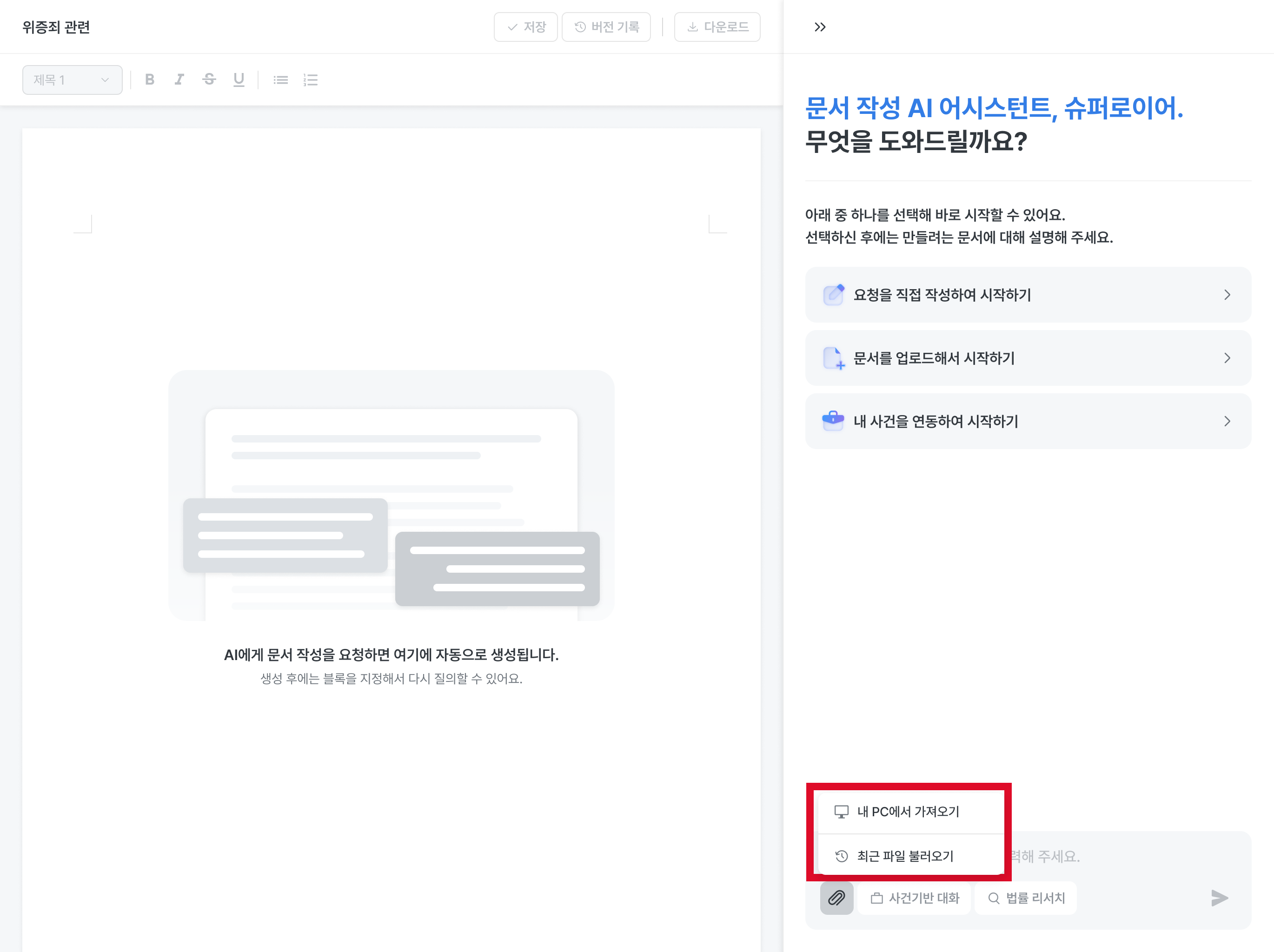 상대방 서면, 상담 자료, 사건 문서 등을 업로드하고, AI에게 초안 작성 요청을 해보세요.
