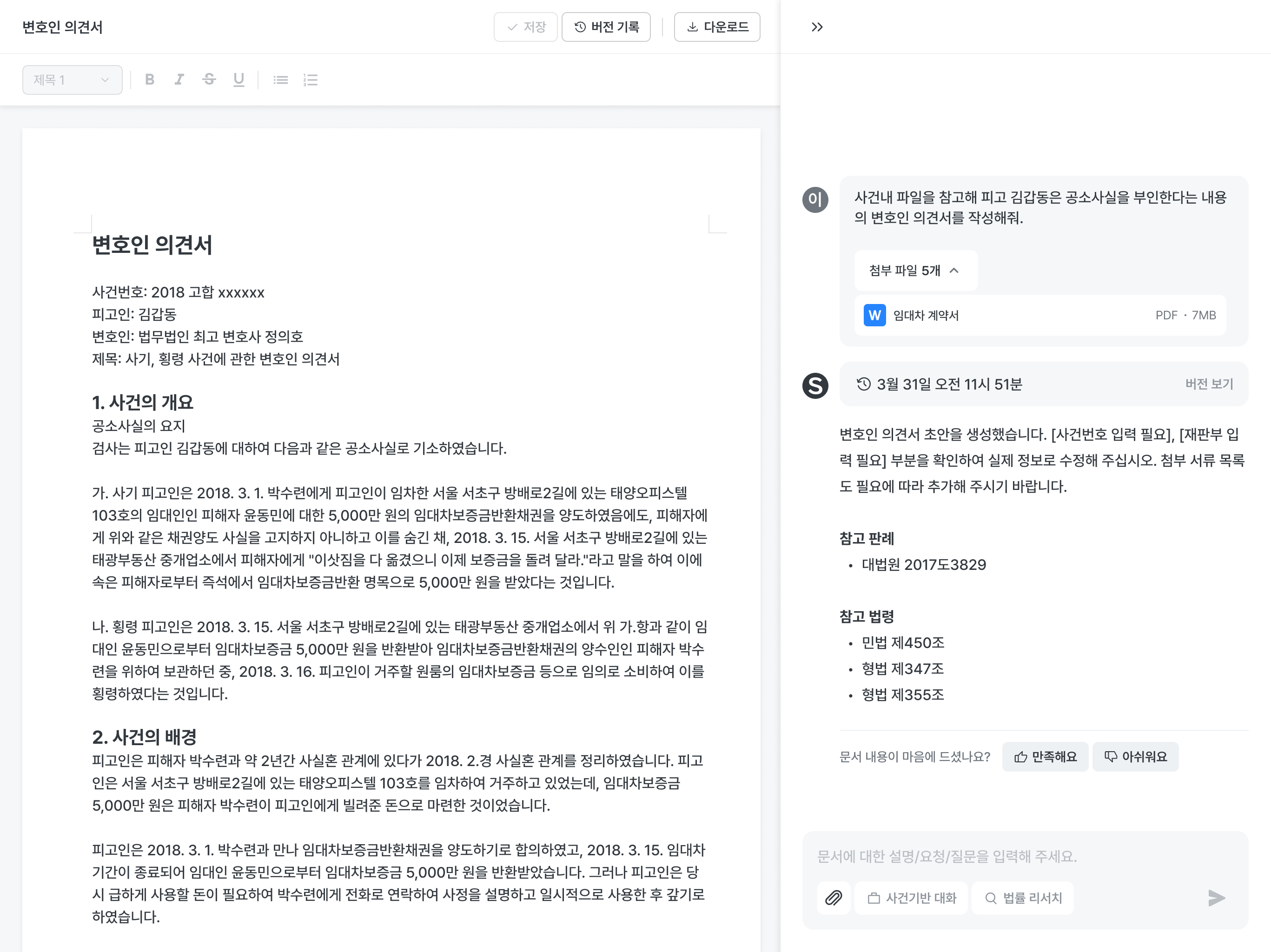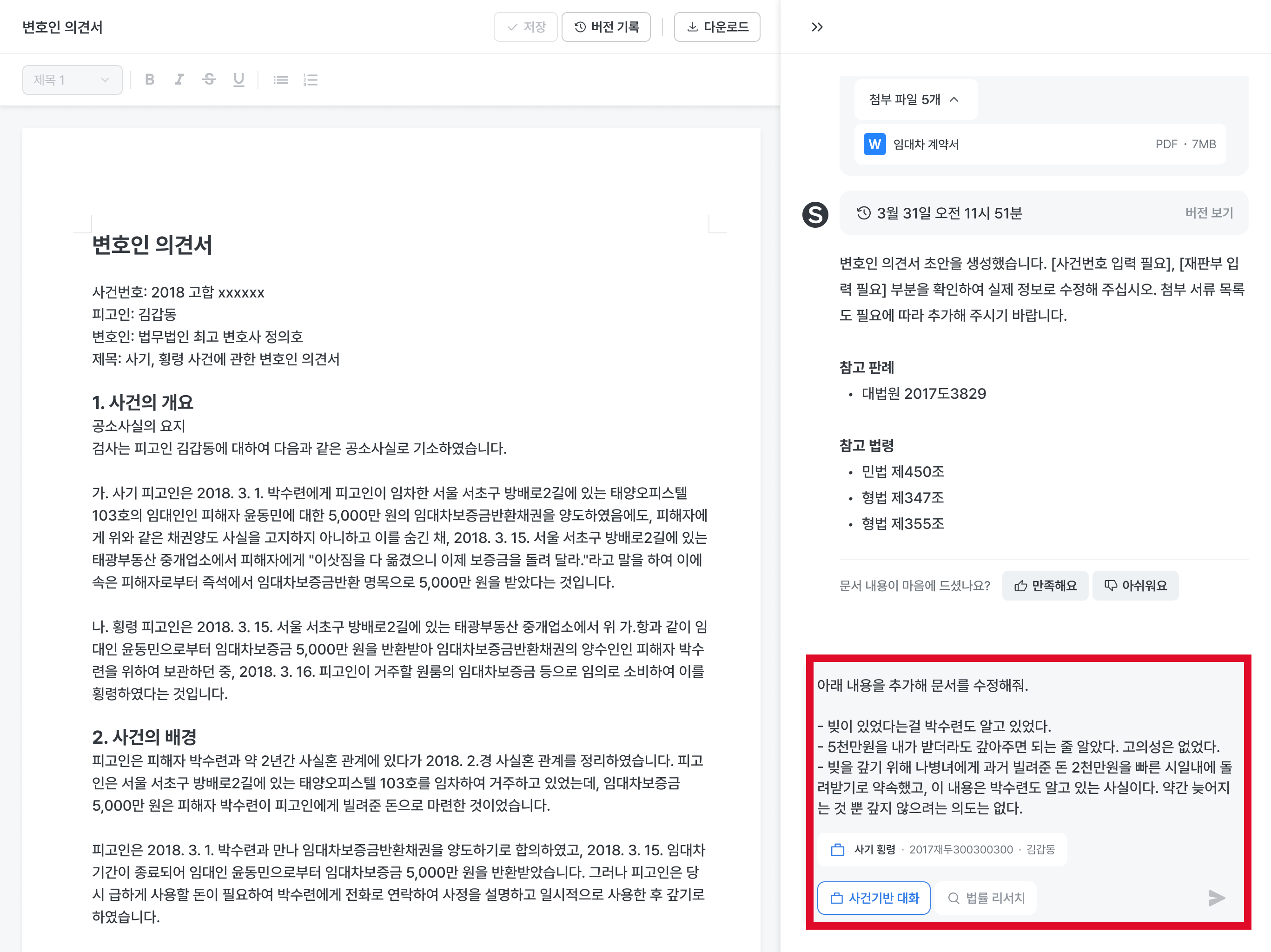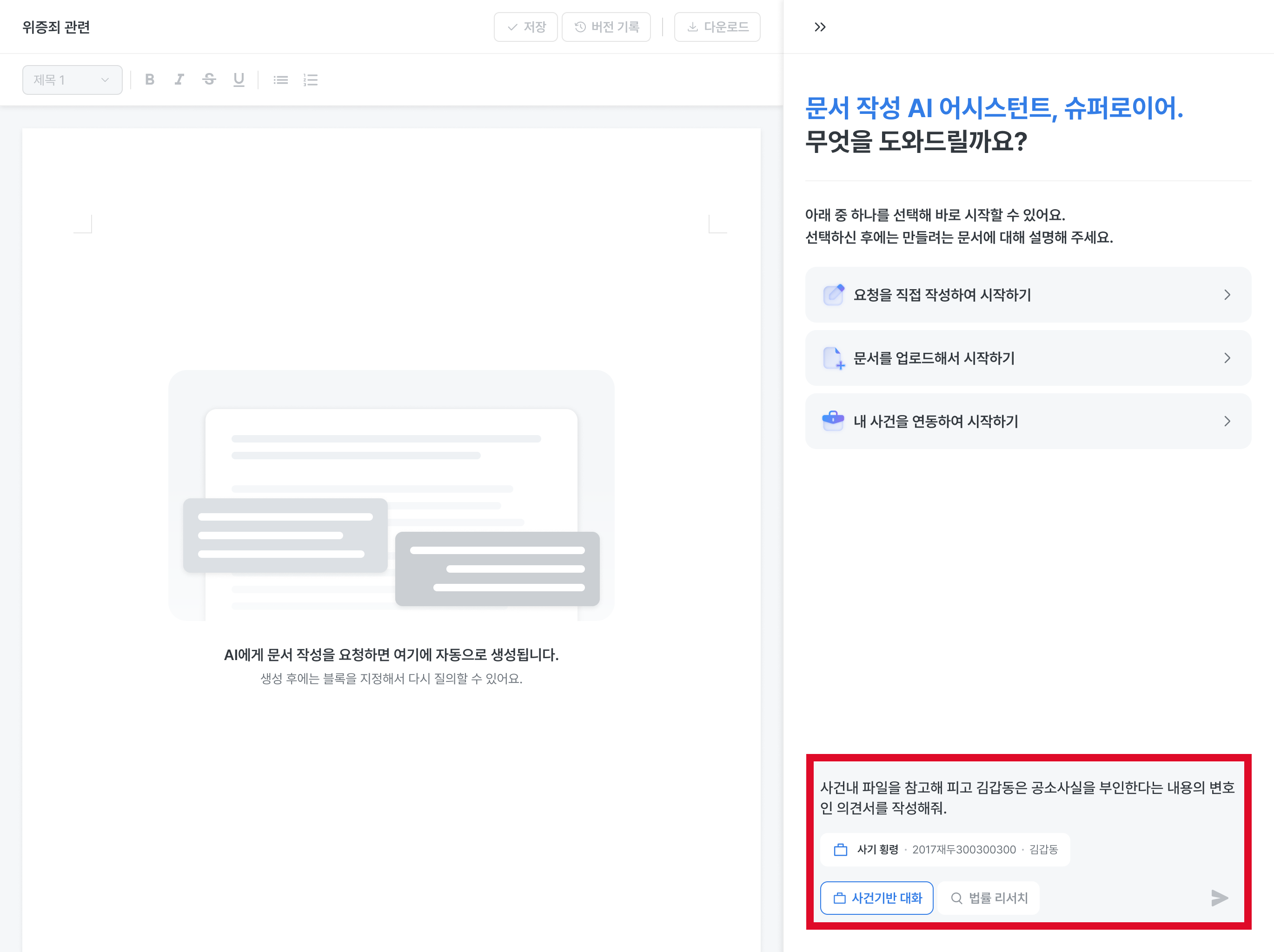 사건 기반 대화를 클릭해서 사건 폴더를 첨부하고 AI에게 초안 작성 요청을 해보세요.