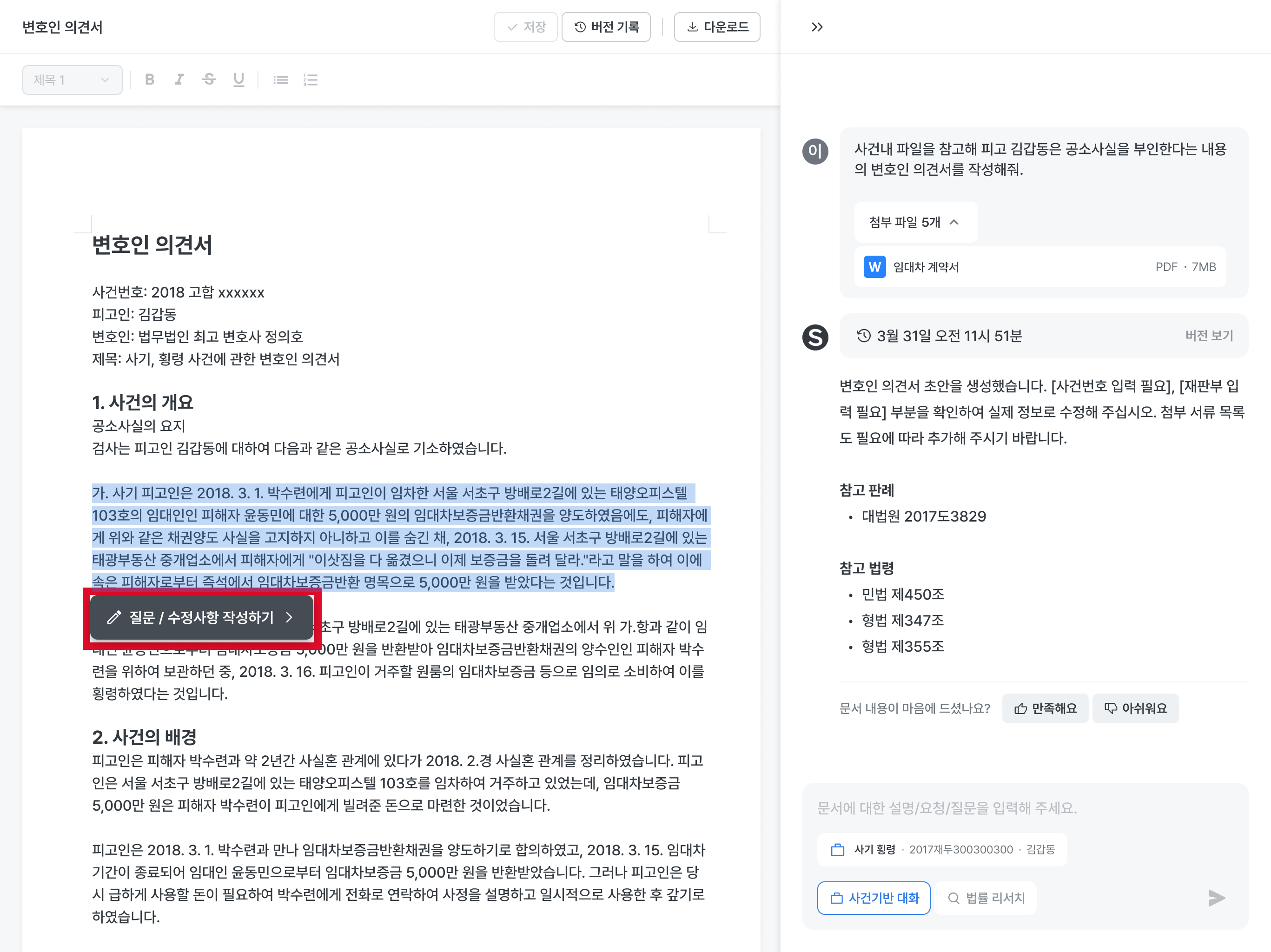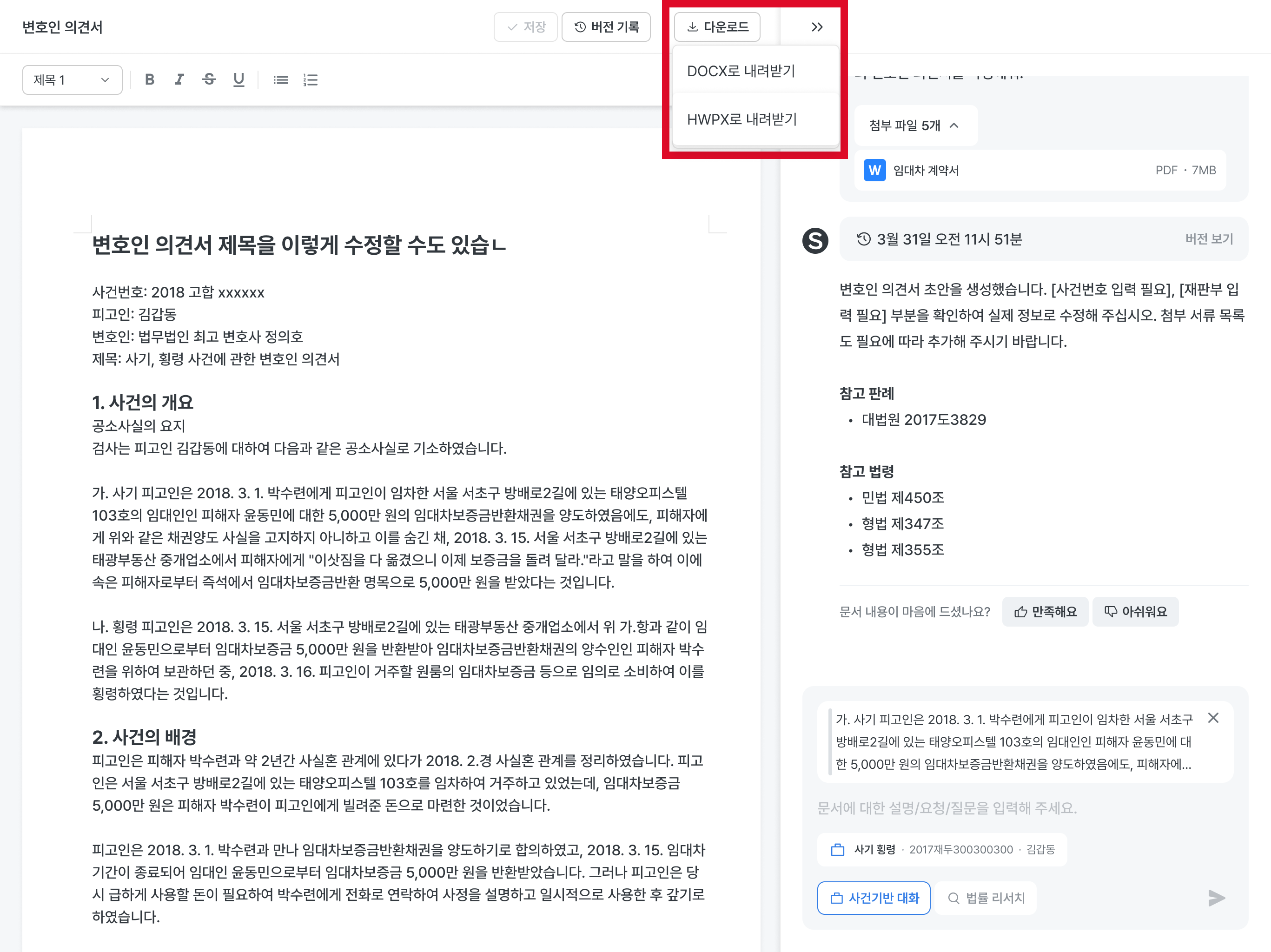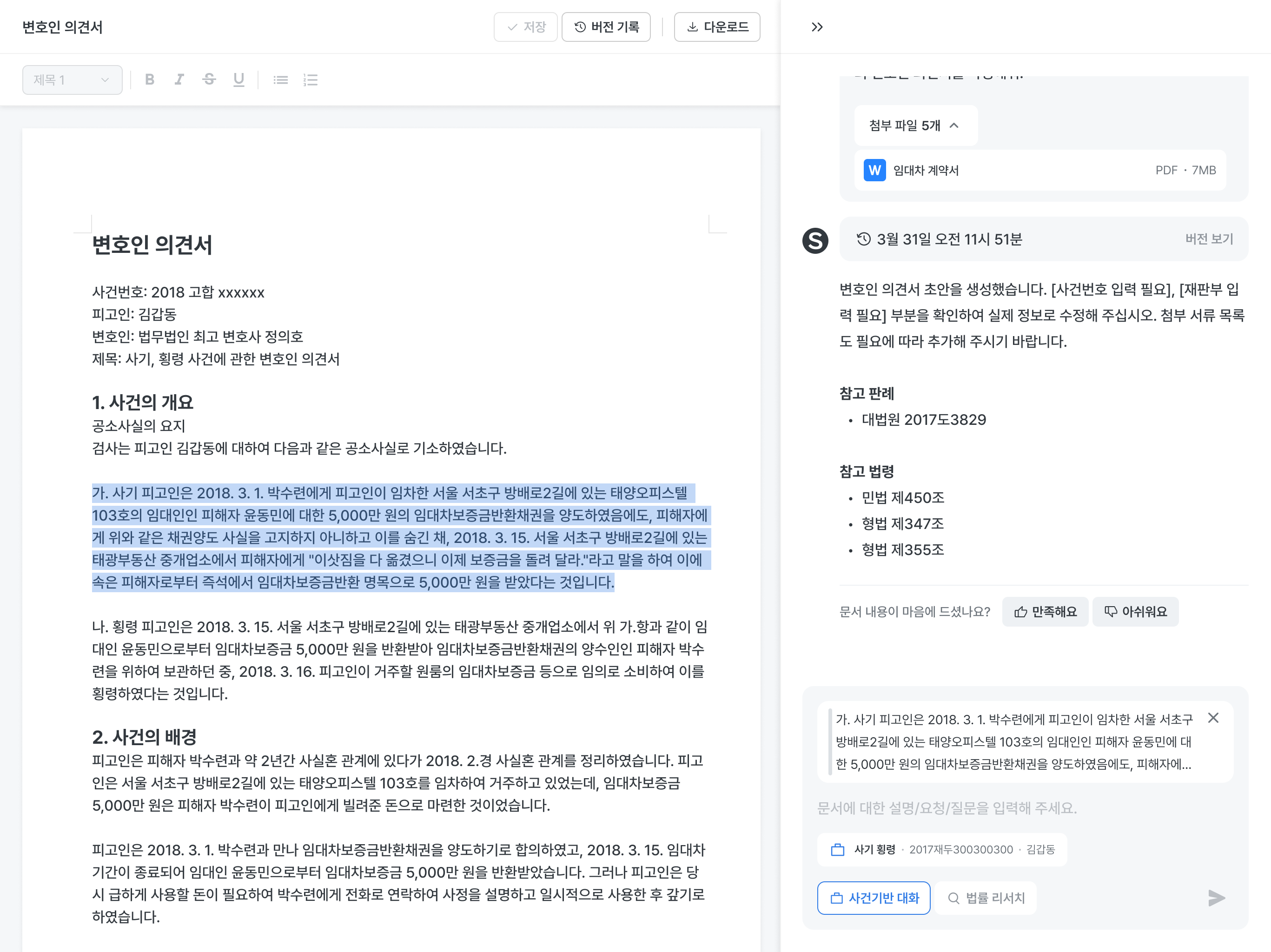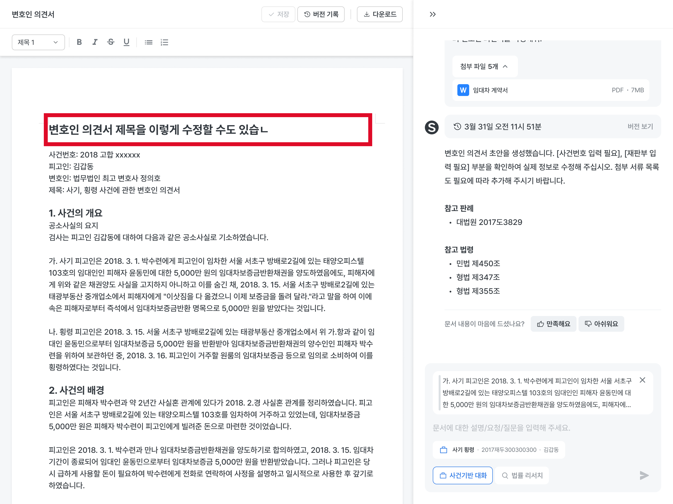 사건 기반 대화를 클릭해서 사건 폴더를 첨부하고 AI에게 초안 작성 요청을 해보세요.