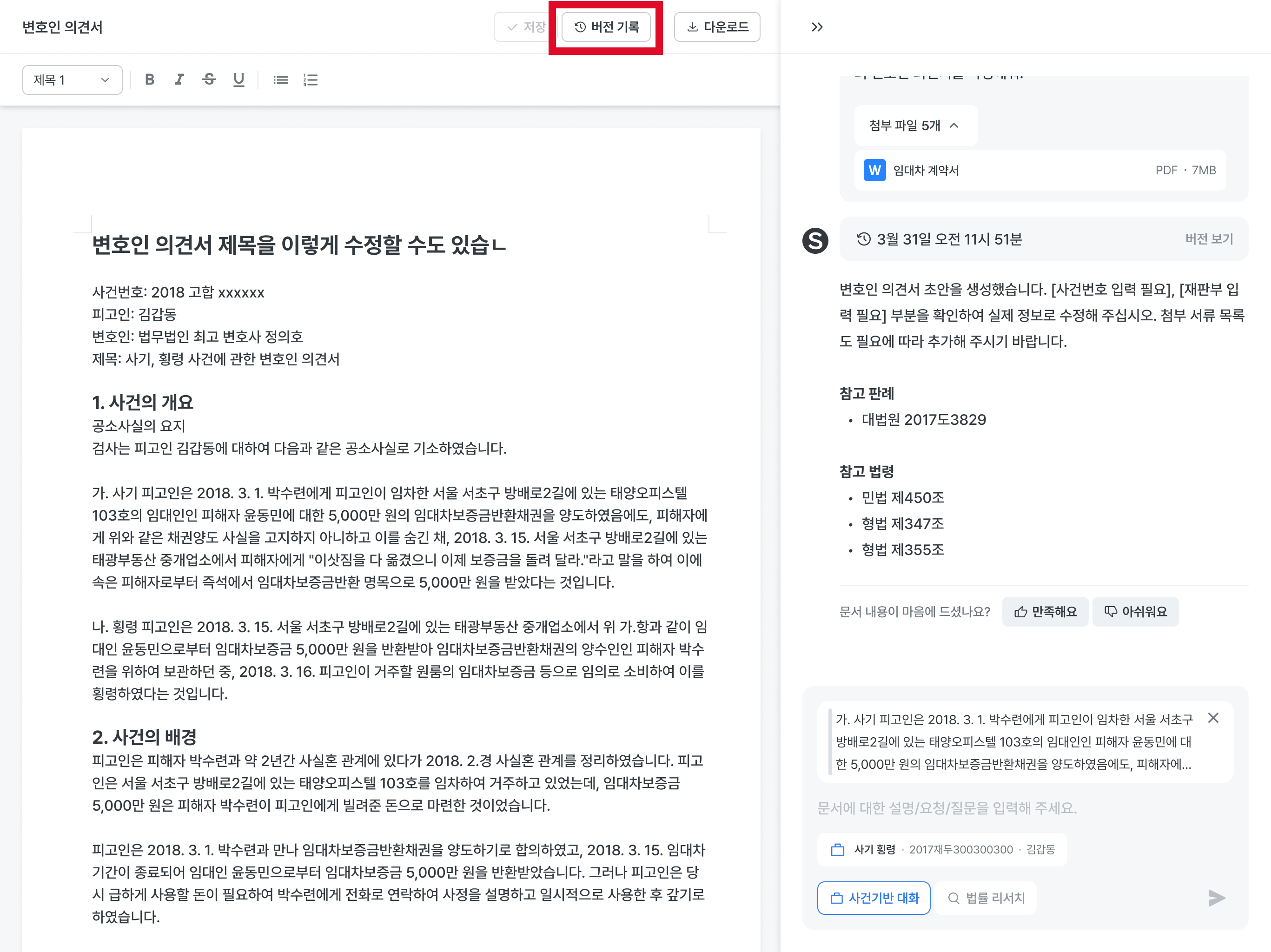 상단 [다운로드]버튼을 클릭하여 문서를 다운로드할 경우 다운로드 시점의 문서가 버전으로 저장됩니다.