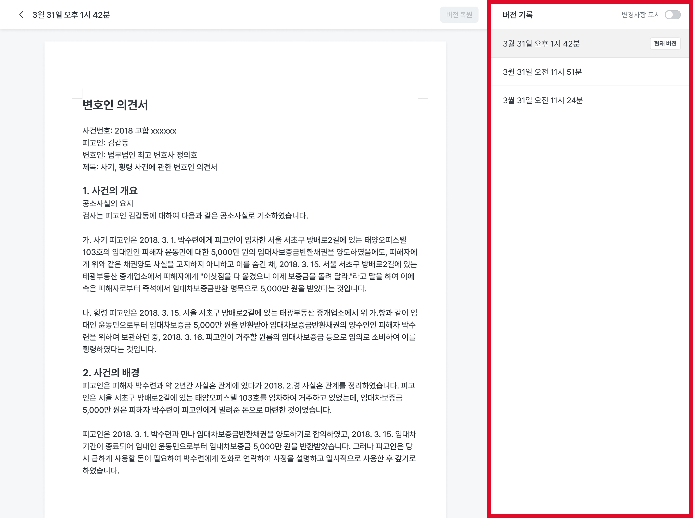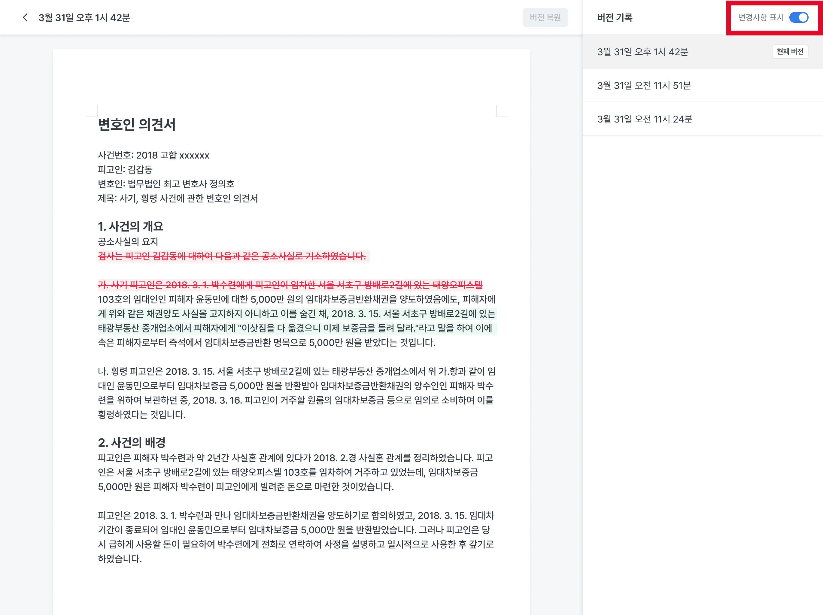 우측 상단의 [변경사항 표시] 토글을 선택하면, 내가 선택한 버전과 직전 버전의 문서 내용이 어떻게 달라졌는지 확인할 수 있습니다.