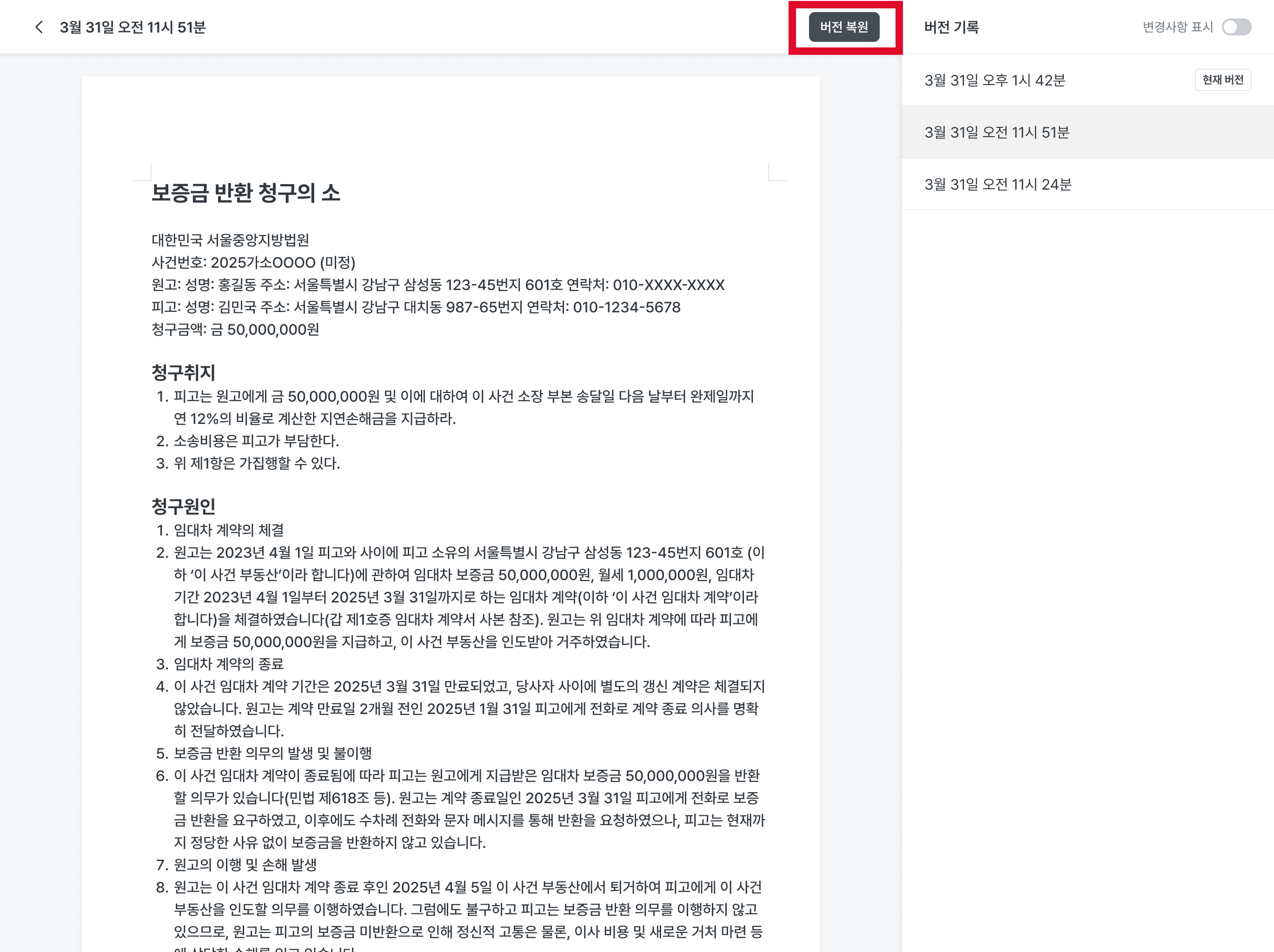 원하는 버전을 선택한 후 [버전 복원] 버튼을 클릭하면 해당 시점의 내용으로 문서가 복원됩니다.