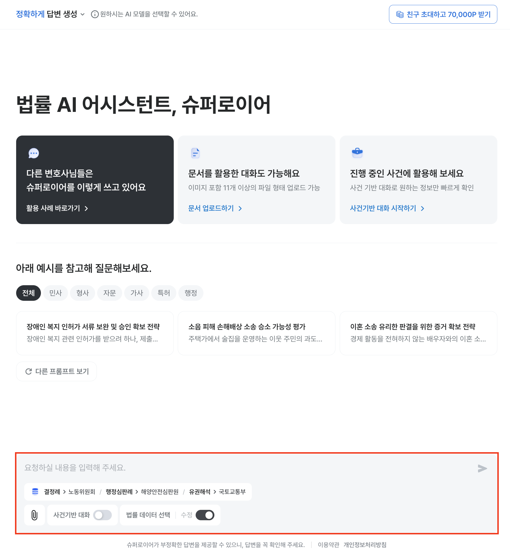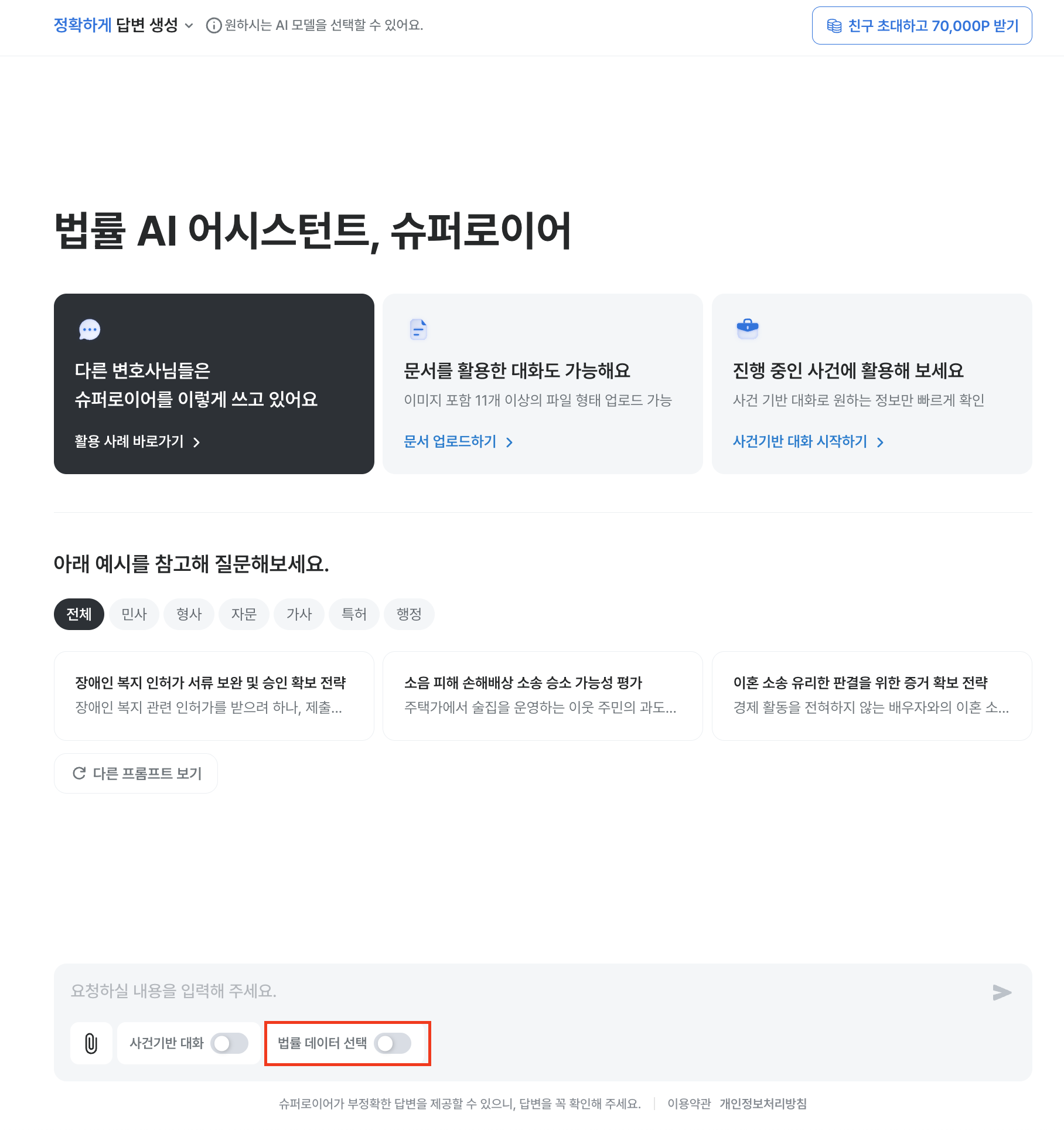설정을 하지 않으면, AI는 판례·법령·박영사 데이터를 우선적으로 참고합니다.단, [법률 데이터 선택] 기능을 활성화하더라도, 선택한 데이터를 참고하여 답변을 생성할 뿐, 반드시 답변에 인용되지는 않을 수 있습니다.