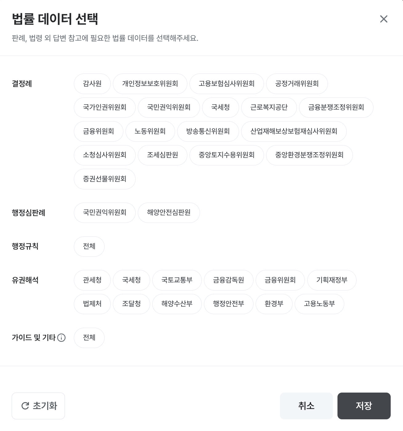 법률 데이터 선택 기능은 사용자가 AI가 참고할 판례, 법령 외 자료(결정례·유권해석·행정심판례 등)의 범위를 지정할 수 있는 기능입니다. 사용자가 특정 기관의 해석 자료를 우선적으로 참고하도록 설정하면, AI는 해당 자료를 우선 검토하여 답변을 제공합니다.
