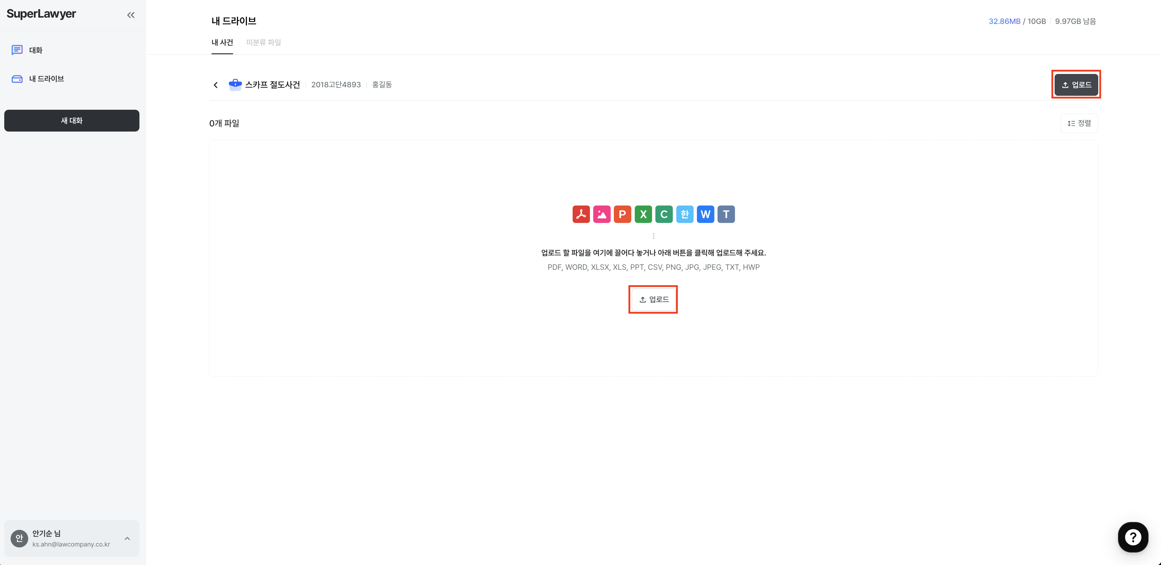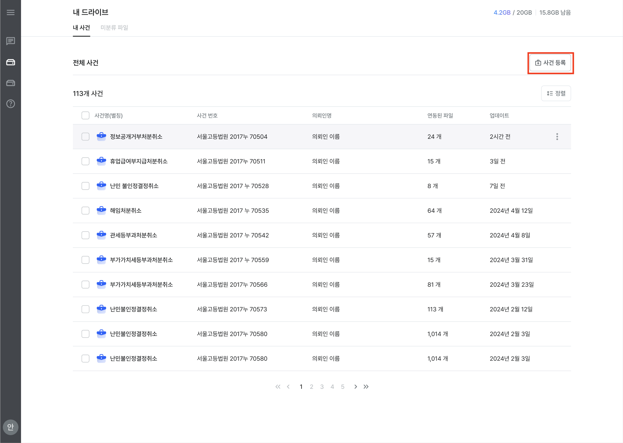 ‘내 드라이브’ 메뉴에서 [사건등록]을 클릭해 새 폴더를 생성하세요.
