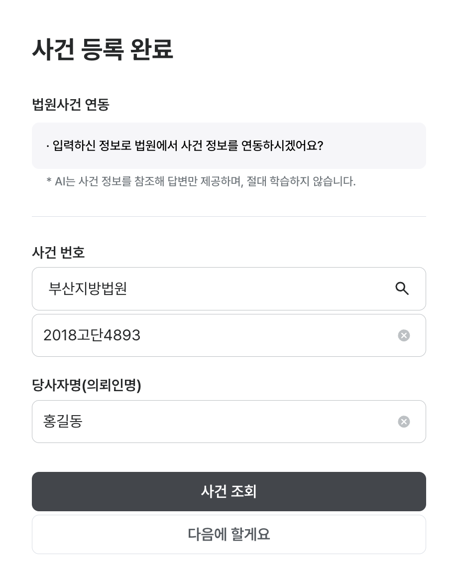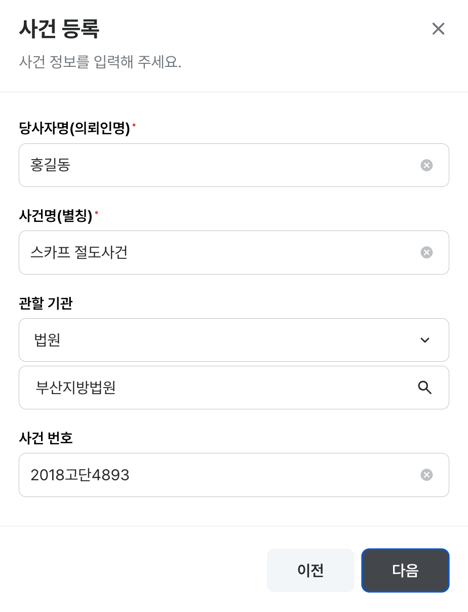 사건 정보를 입력하고 [다음]을 클릭하면 사건 등록이 완료되고 입력한 사건명으로 사건 폴더가 생성됩니다.