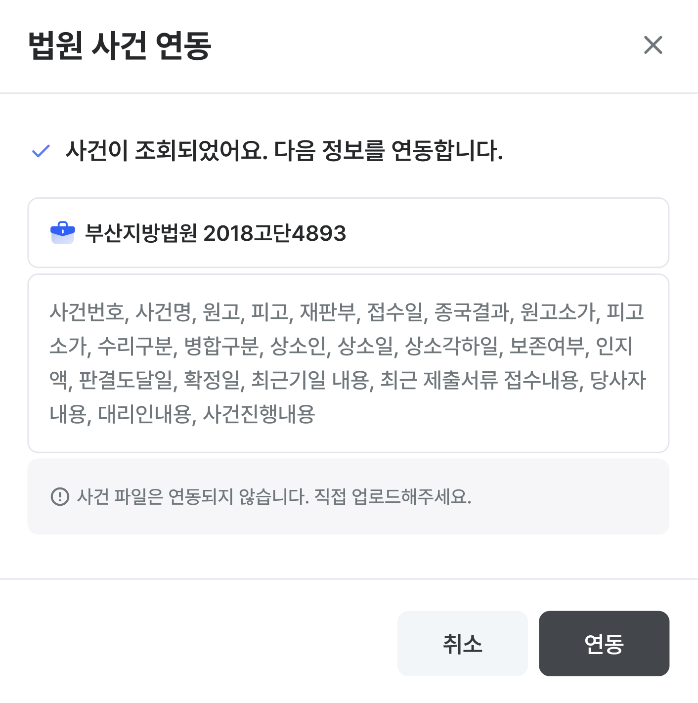 법원에서 조회된 사건 정보를 확인 후 [연동]을 클릭하면 곧바로 슈퍼로이어에 사건 정보가 연동됩니다. (*2025년 5월 30일 기준 법원 사건 연동 기능은 서비스 일시 중단 상태입니다)