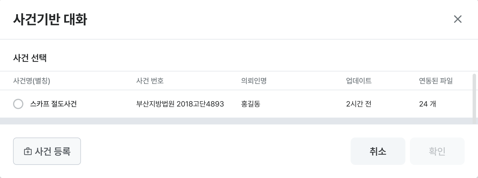 대화에 첨부할 사건폴더를 선택하고 [확인]을 클릭합니다.